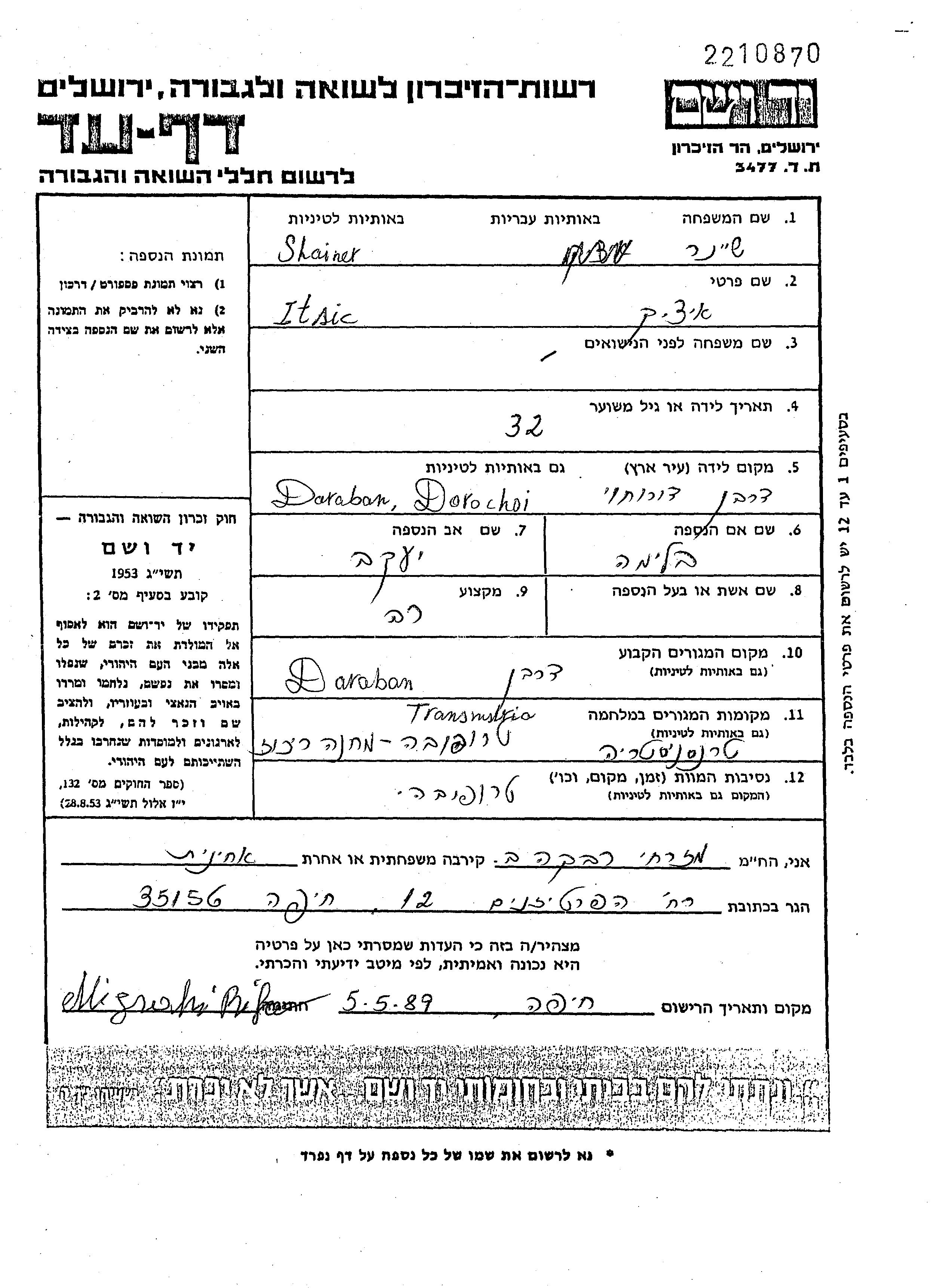 Itsic Shainer was born in Darabani, Romania to Yaakov and Blima. He was a rabbi. Prior to WWII he lived in Darabani, Romania. During the war he was in Transnistria, Ukraine (USSR).