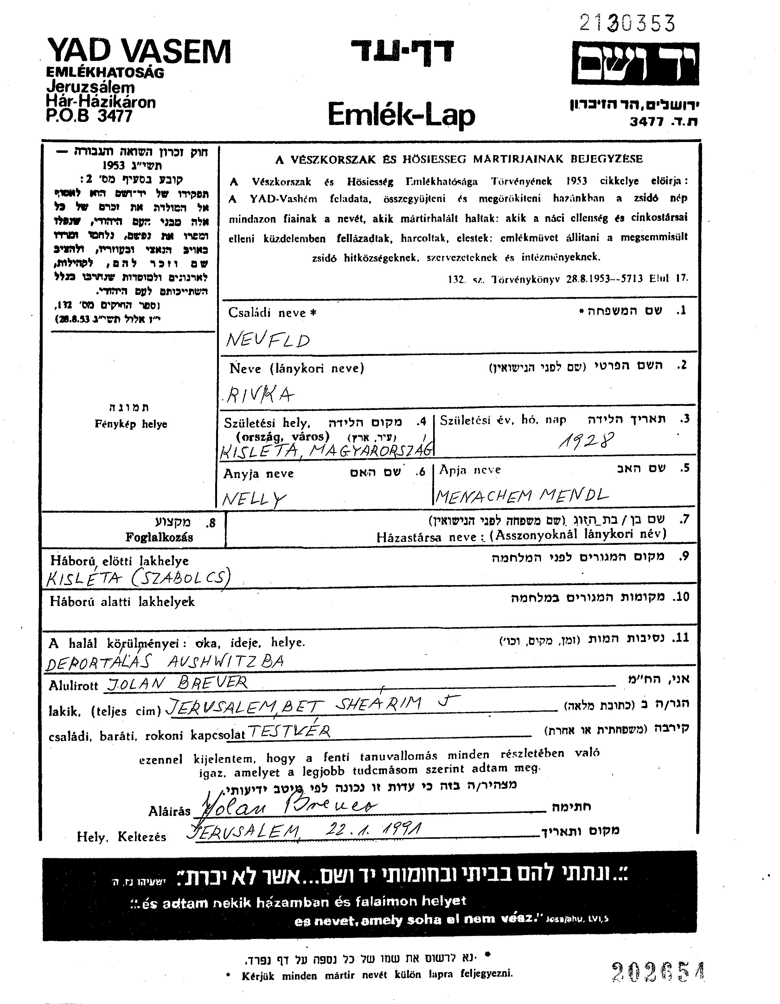 Neufeld Rivka 1928 Kisleta, Hungary Page of Testimony