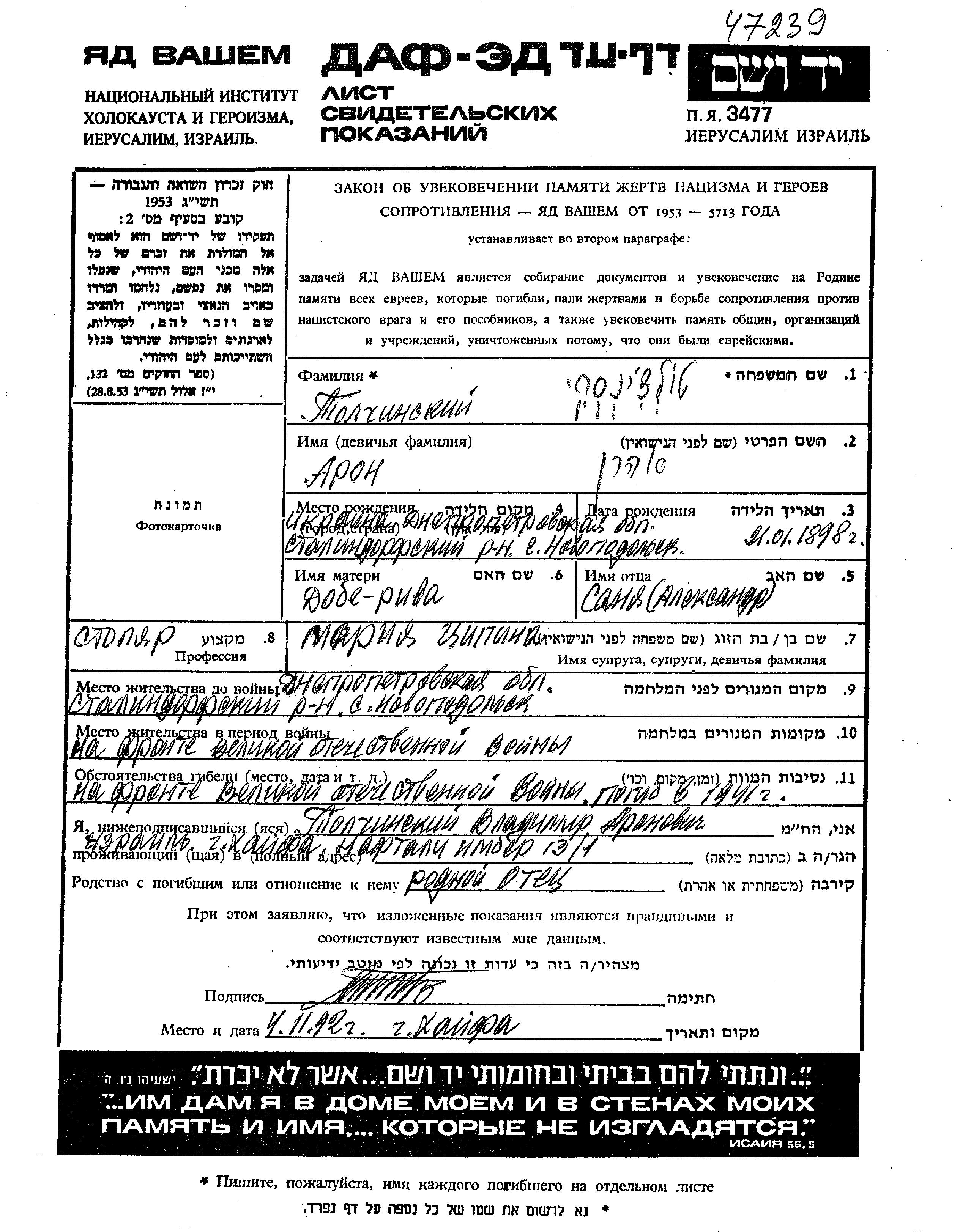 Aron Tolchinski was born in Novopodolsk, Ukraine (USSR), 1898 to Aleksandr and Dobe Riva. He was a carpenter and married to Maria. Prior to WWII he lived in Novopodolsk, Ukraine (USSR). During the war he was in the Soviet armed forces. Aron was killed in military service in WWII. Place of death: unknown, 1941.