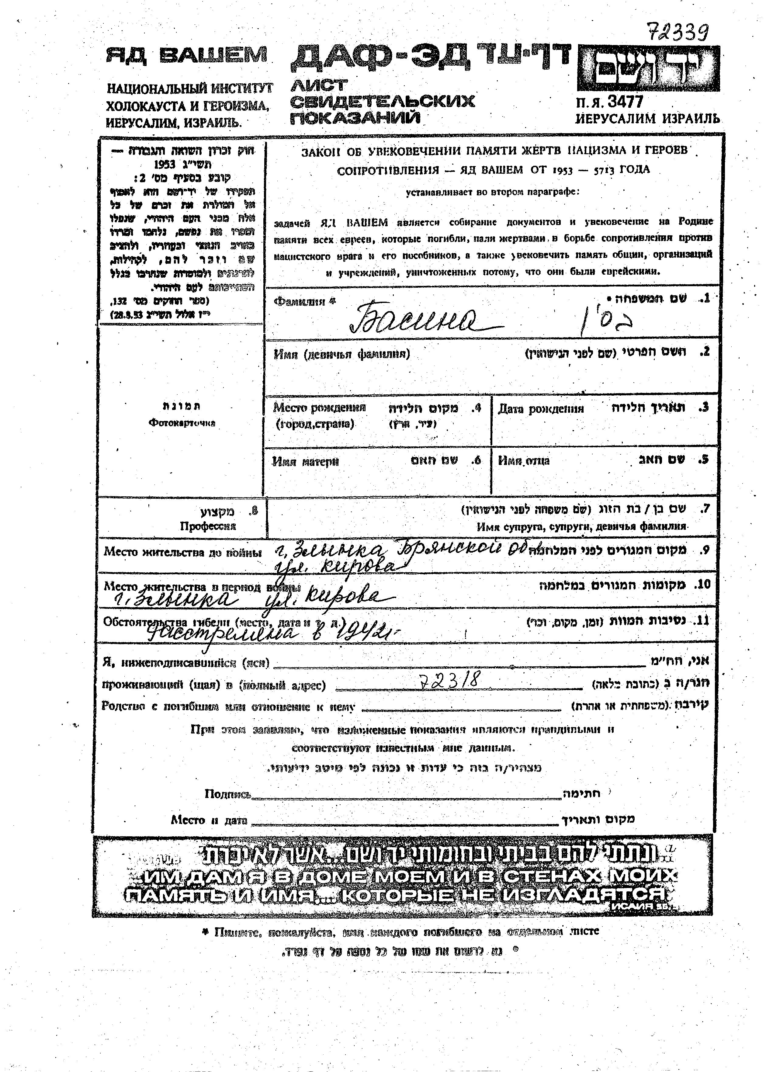 Basin First name unknown Zlynka, Russia (USSR) Page of Testimony