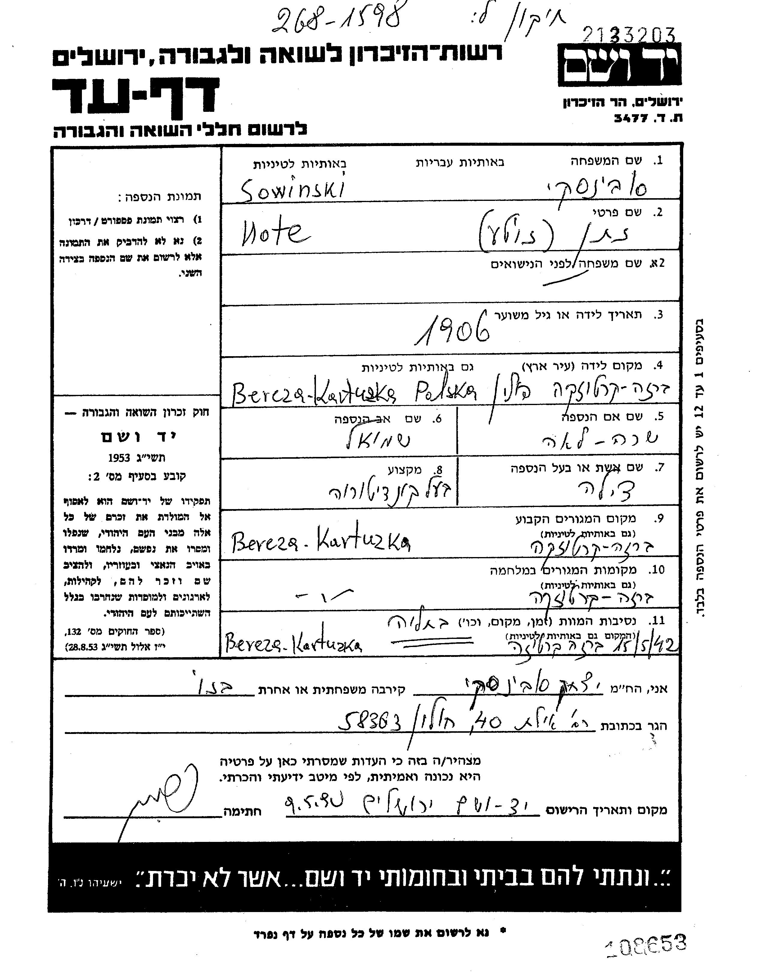 Sowinski Note Bereza Kartuska, Poland Page of Testimony