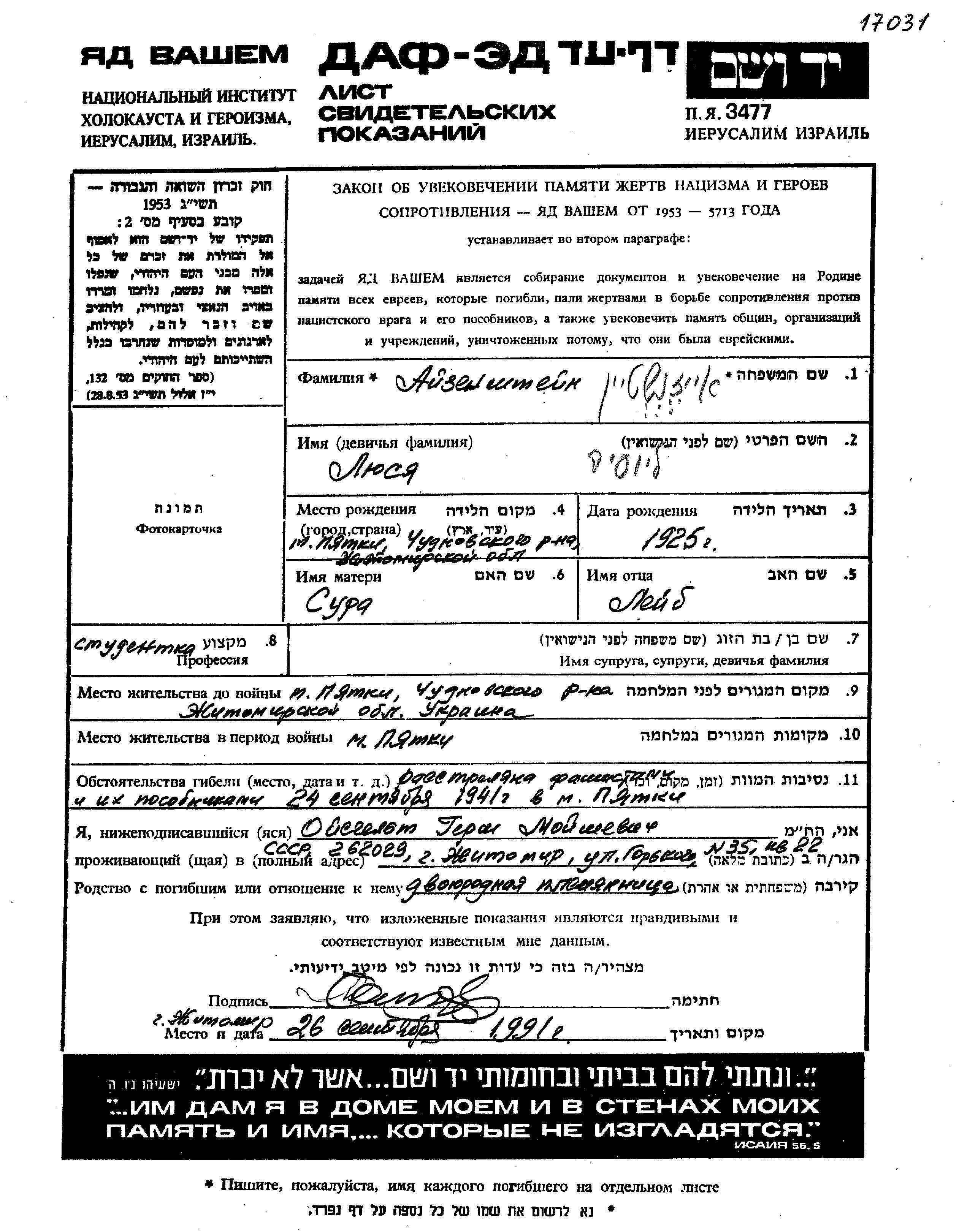 Liusia Aizenshtein was born in Pyatka, Ukraine (USSR), 1925 to Leib and Sura nee Valdman. She was a student and child. Prior to WWII she lived in Pyatka, Ukraine (USSR). During the war she was in Pyatka, Ukraine (USSR). Liusia was murdered in the Shoah. Place of death: Pyatka, Ukraine (USSR), 24/09/1941.