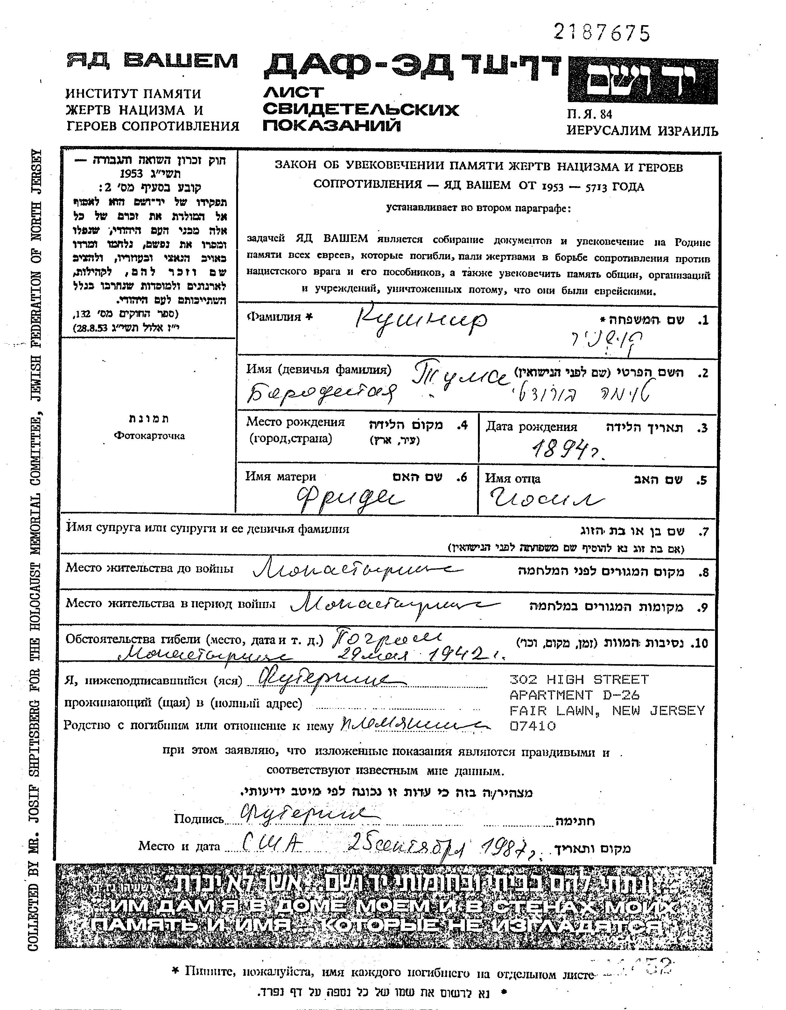 Toma Tomar Kushnir was born, 1894 to Yosel and Frida. He was married to Yona nee Borodaty. Prior to WWII he lived in Monastyrishche, Ukraine (USSR). During the war he was in Monastyrishche, Ukraine (USSR). Toma Tomar was murdered in the Shoah. Place of death: Monastyrishche, Ukraine (USSR), 29/05/1942.
