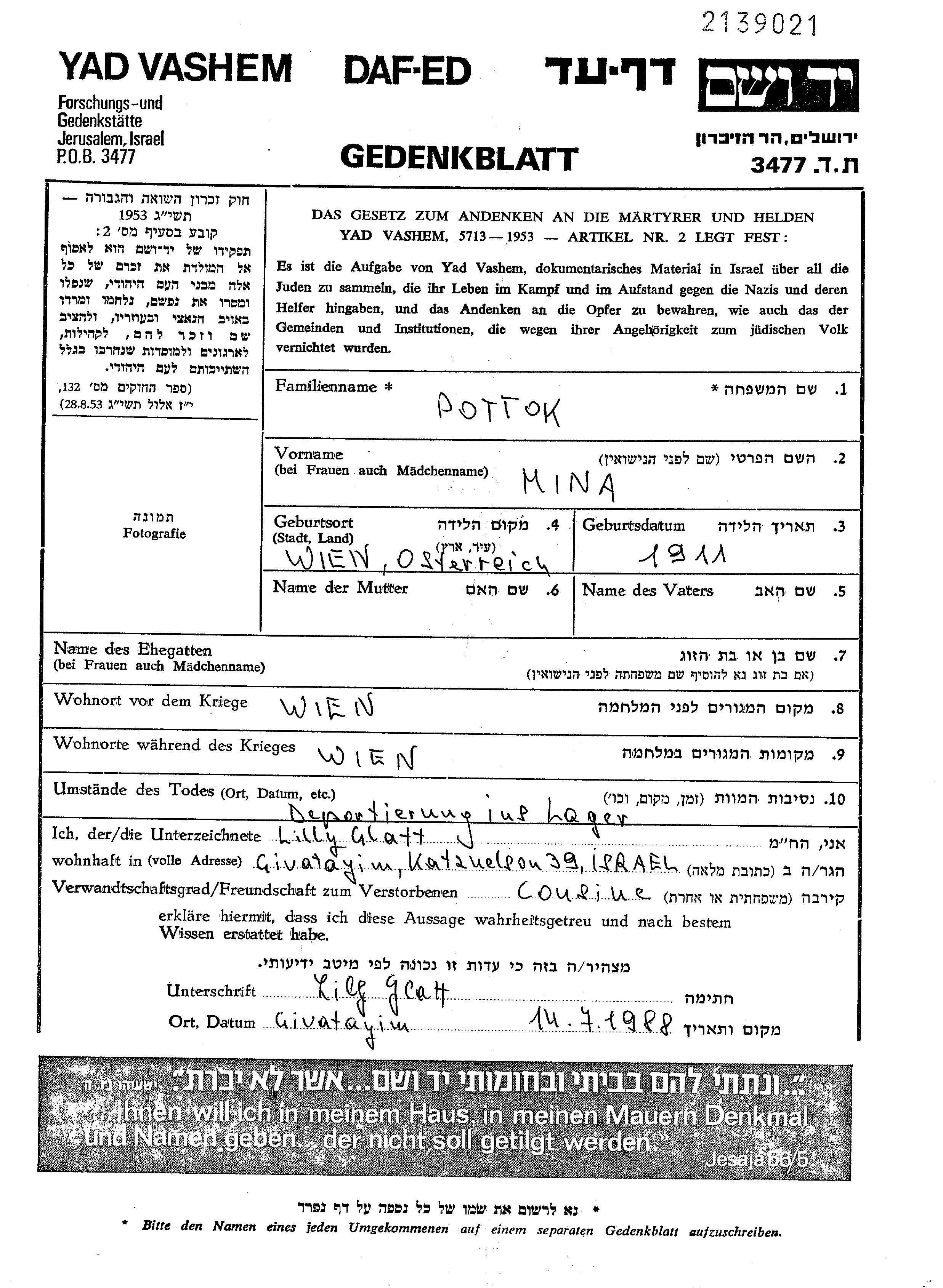 Mina Pottok was born in Wien, Austria. Prior to WWII she lived in Wien, Austria. During the war she was in Wien, Austria.