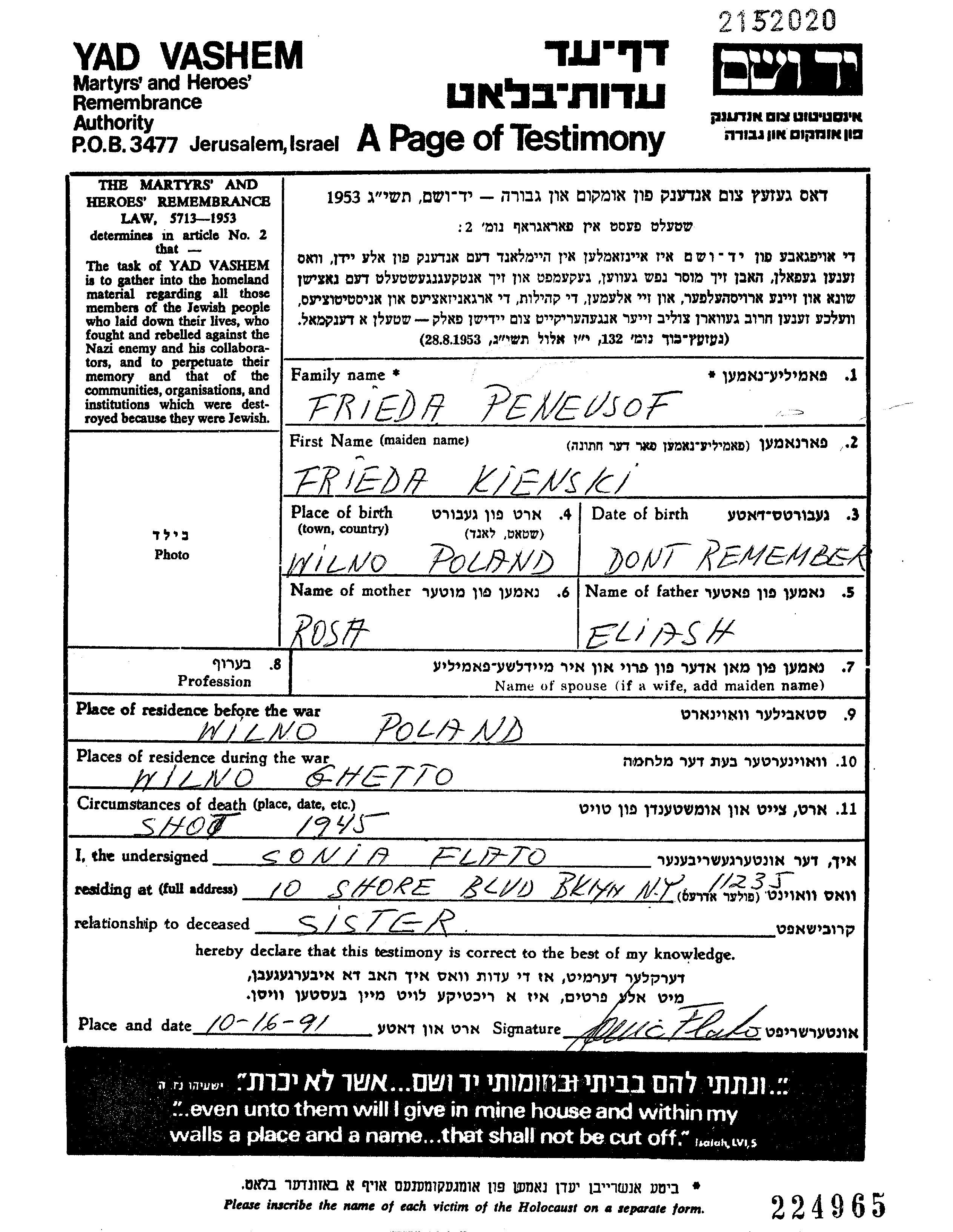 Pineusov Frieda Wilno, Poland Page of Testimony