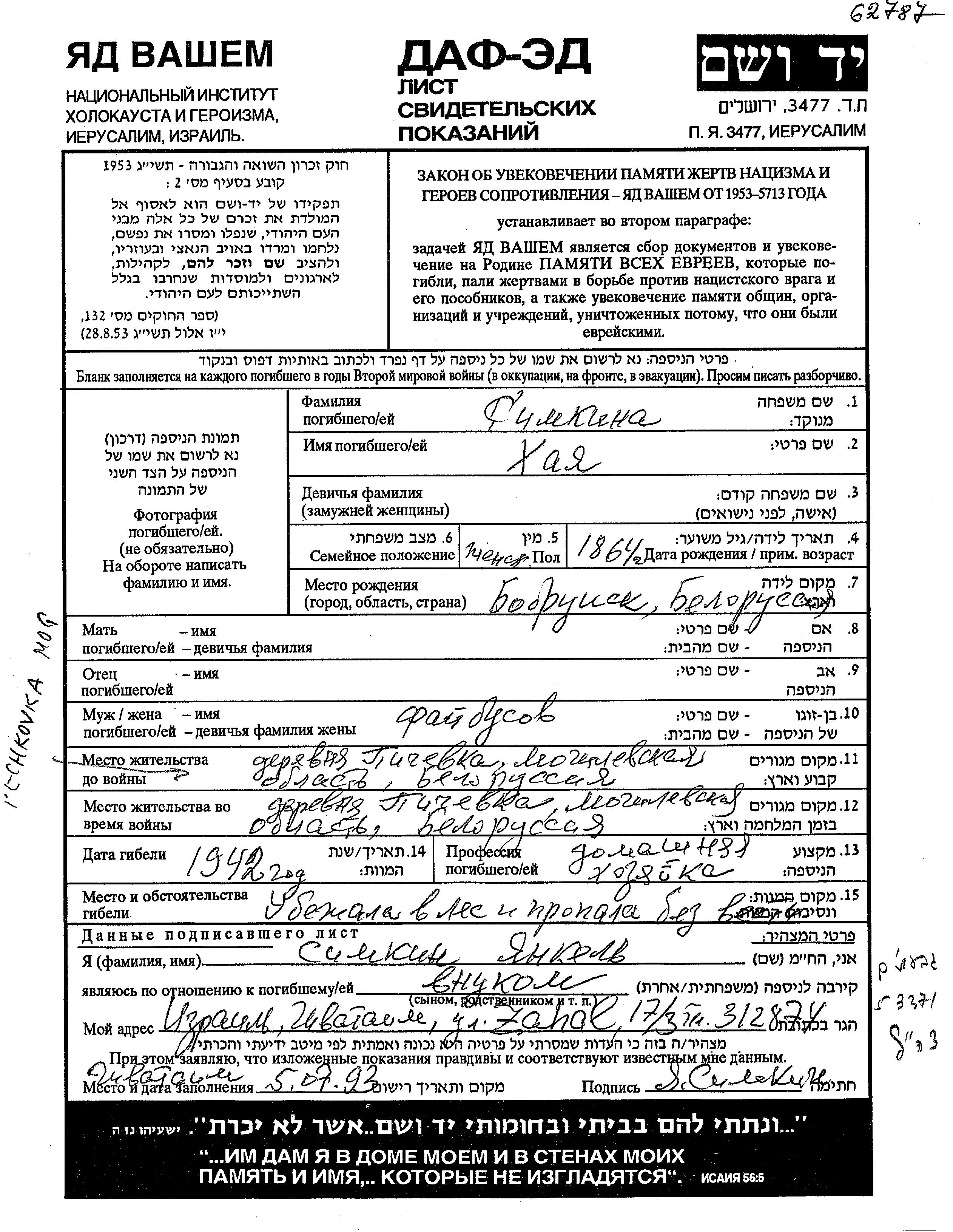 Khaia Simkin was born in Bobruysk, Belorussia (USSR), 1864. She was a housewife and married. Prior to WWII she lived in Pechkovka, Belorussia (USSR). During the war she was in Pechkovka, Belorussia (USSR). Khaia was murdered in the Shoah. Place of death: Mogilev, Belorussia (USSR), 1942.