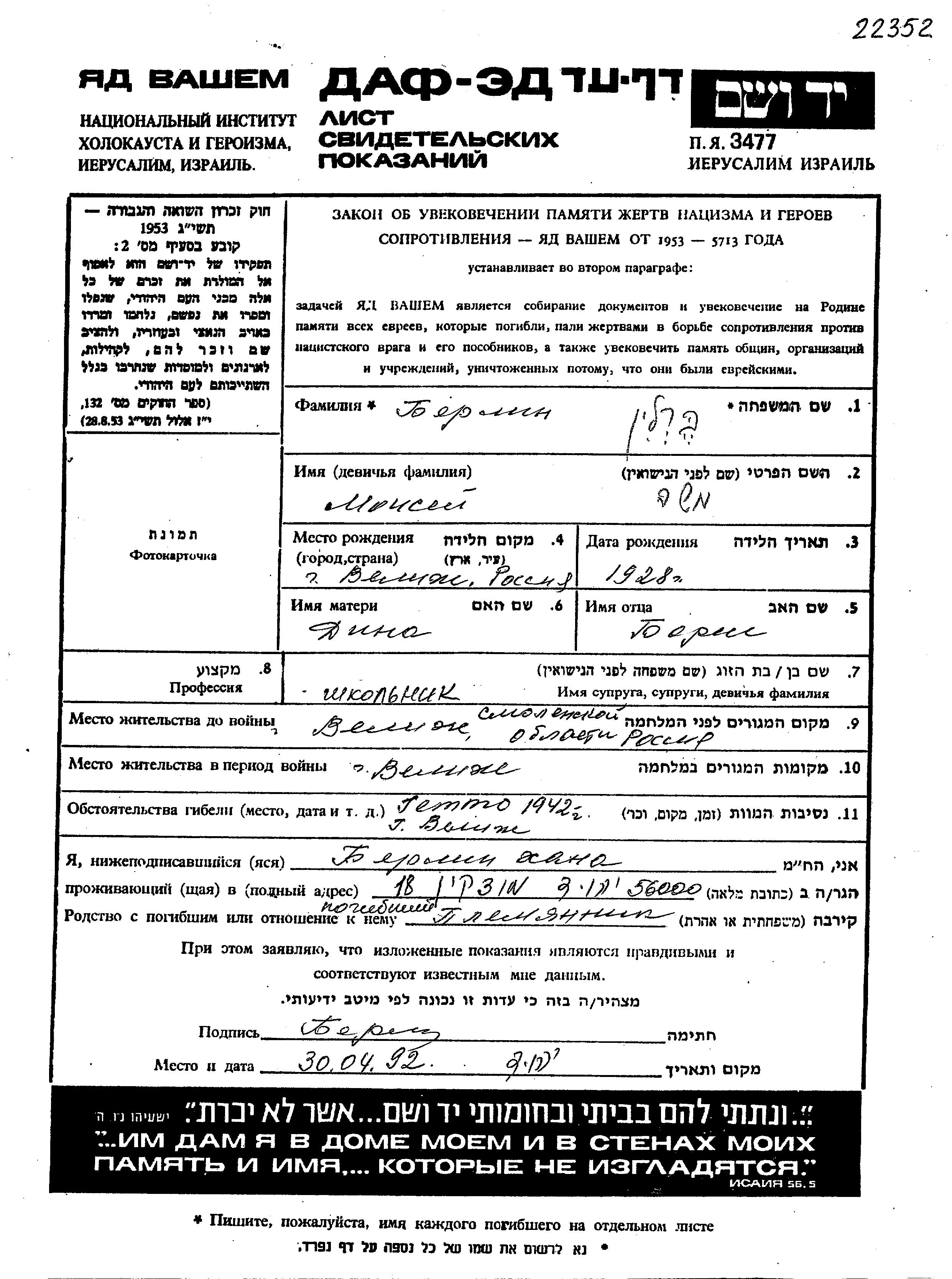 Berlin Moisei 1928 Velizh, Russia (USSR) Page of Testimony