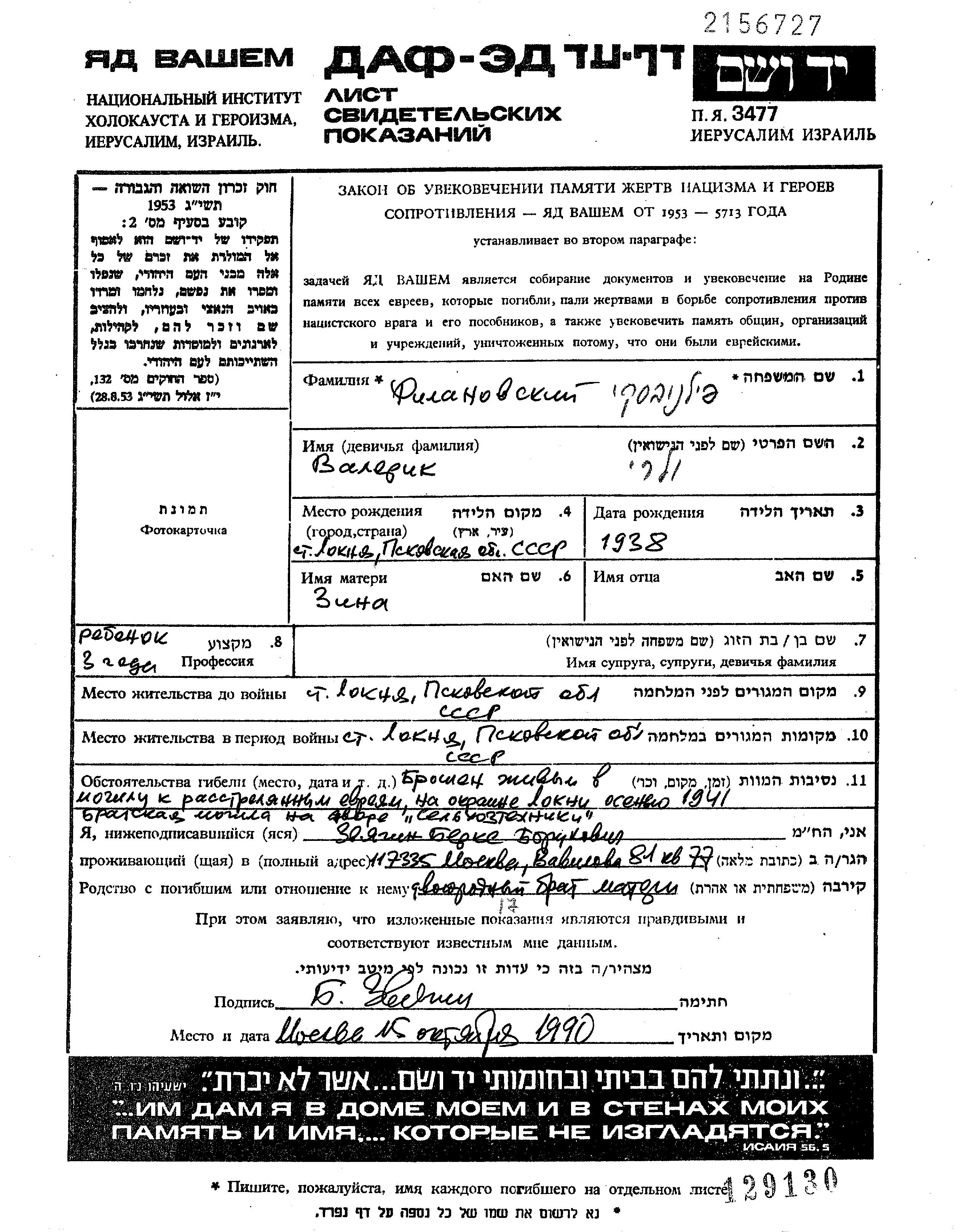 Valerik Filanovski was born in Loknya, Russia (USSR), 1938 to Zina nee Tzvik. He was child. Prior to WWII he lived in Loknya, Russia (USSR). During the war he was in Loknya, Russia (USSR). Valerik was murdered in the Shoah. Place of death: Loknya, Russia (USSR), 1941.