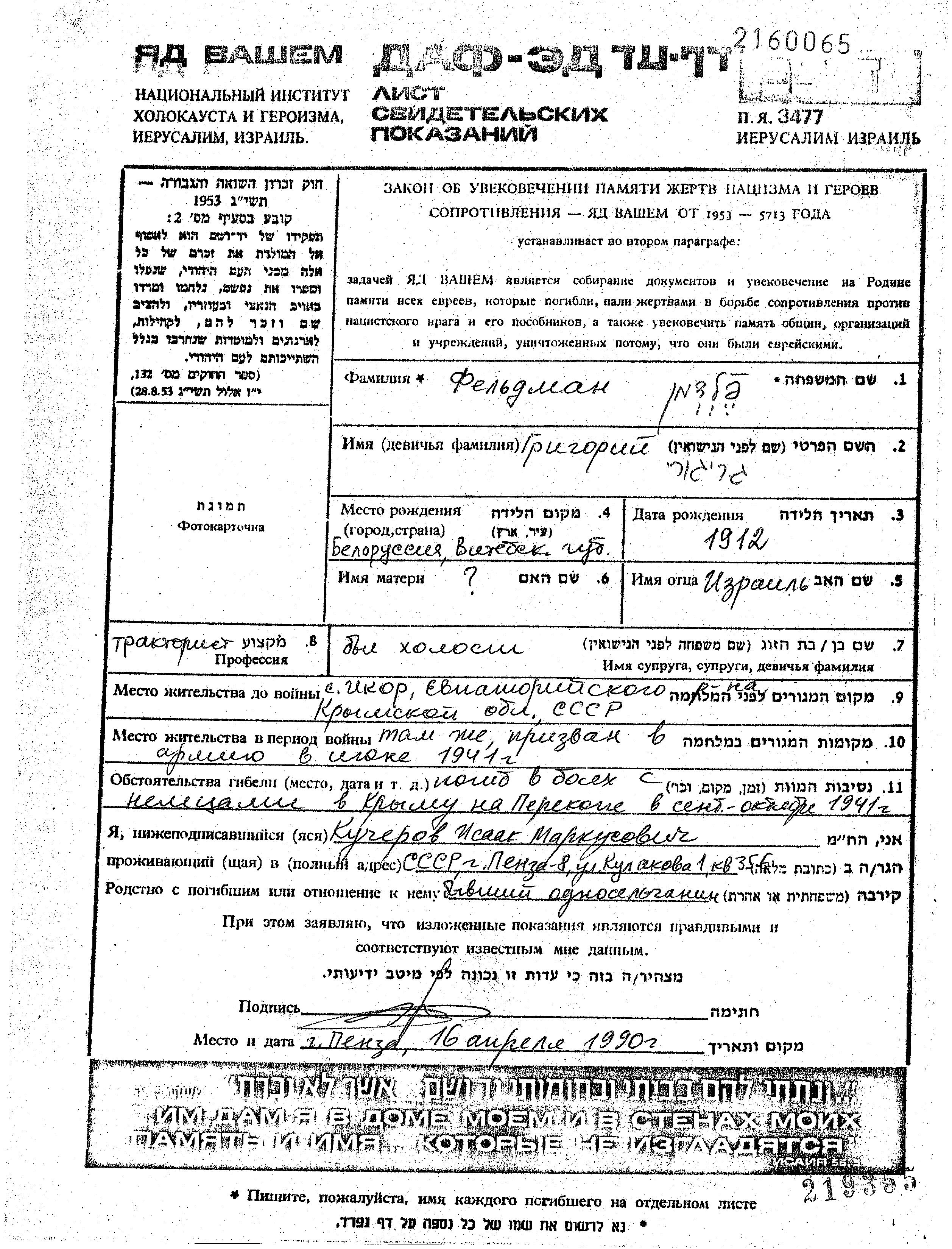 Feldman Grigori 1912 Ikor, Russia (USSR) Page of Testimony