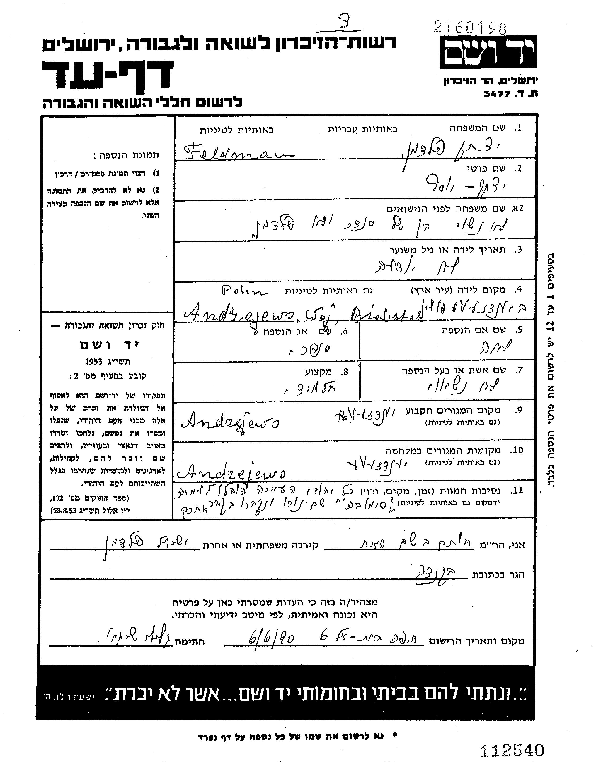 Yitzkhak Iosif Feldman was born in Andrzejewo, Poland to Sender and Lea nee Lewinski. He was a pupil and single. Prior to WWII he lived in Andrzejewo, Poland. During the war he was in Andrzejewo, Poland. Yitzkhak Iosif was murdered in the Shoah. Place of death: Szumowo, Poland.
