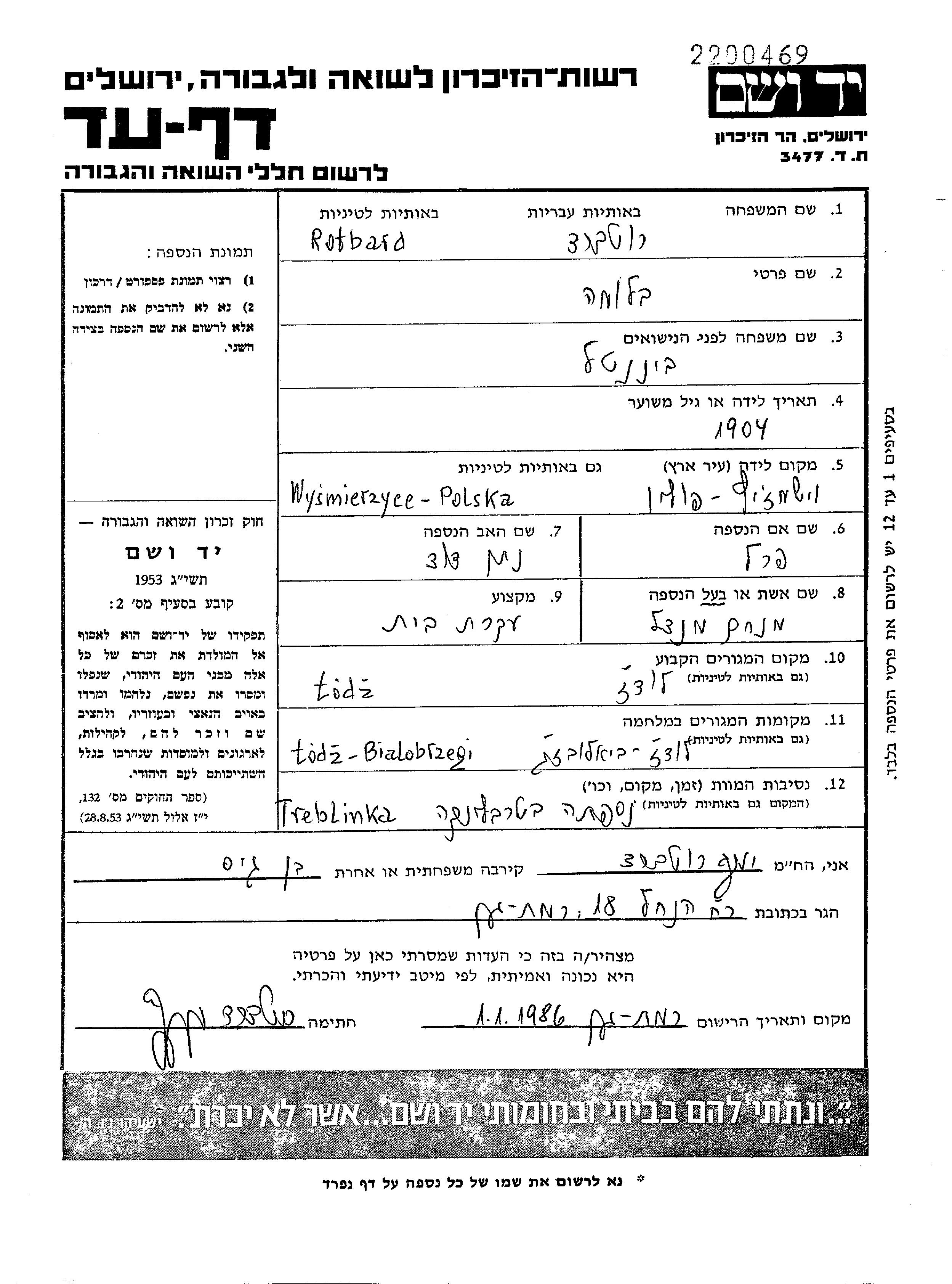Blima Rotbard nee Bienental was born in Wysmierzyce, Poland, 1904 to Natan Dvid and Perl. She was a housewife and married to Menahem Mendel. Prior to WWII she lived in Lodz, Poland. During the war she was in Lodz, Poland. Blima was murdered in the Shoah. Place of death: Treblinka, Poland.