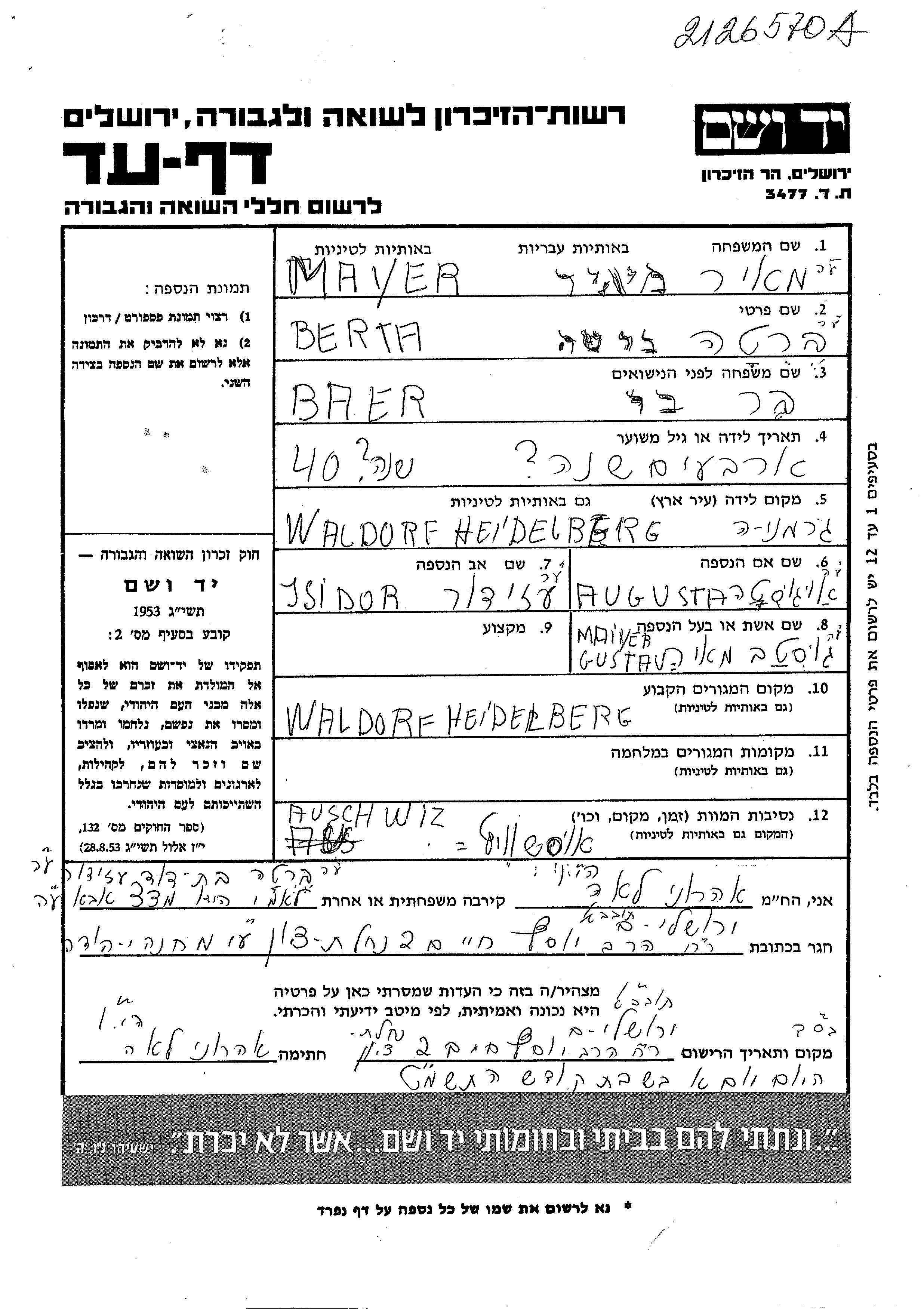 Mayer Berta Walldorf, Germany Page of Testimony
