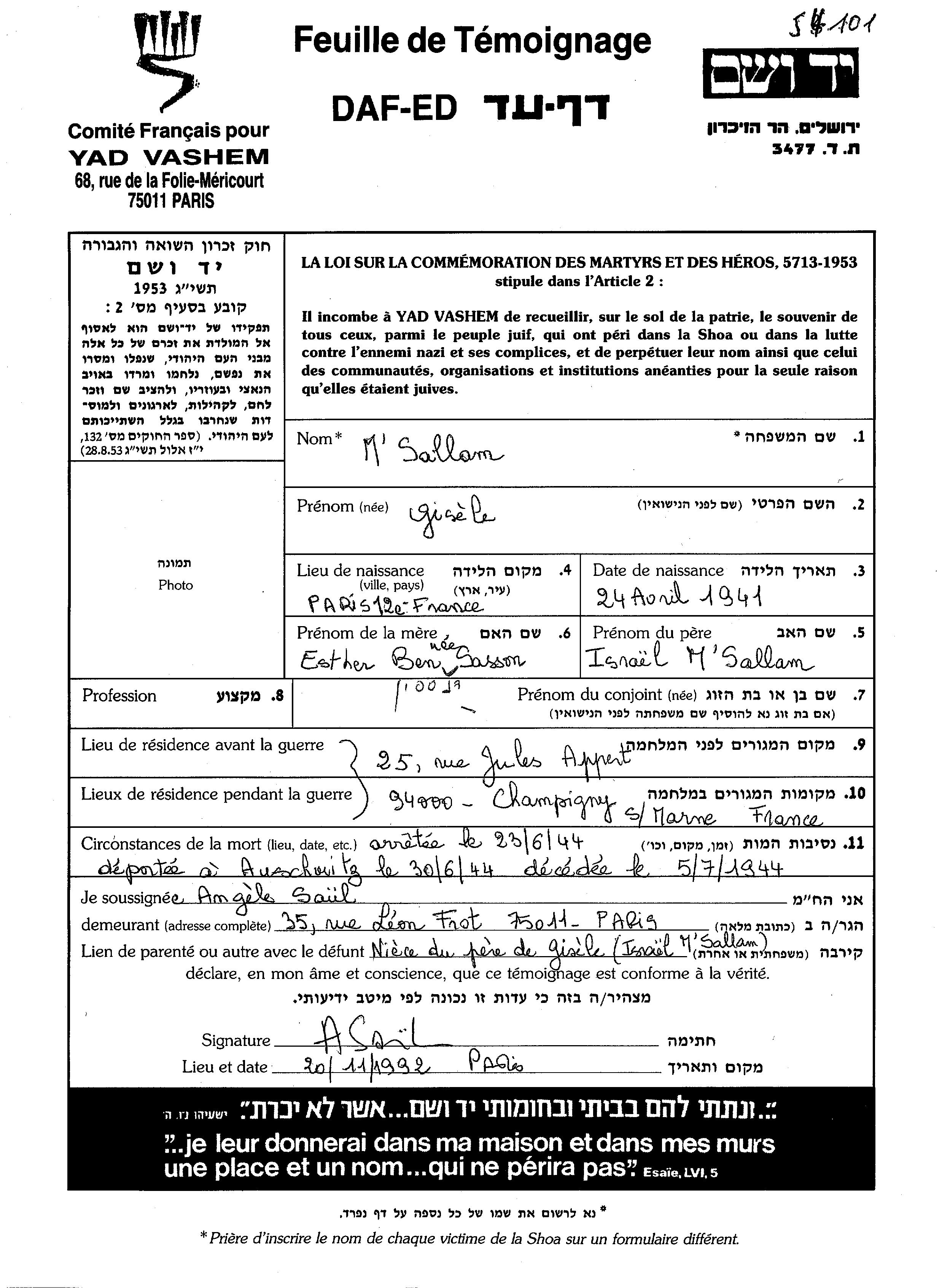 Sallam Gisele Zhizel 1941 Champigny sur Marne, France Page of Testimony