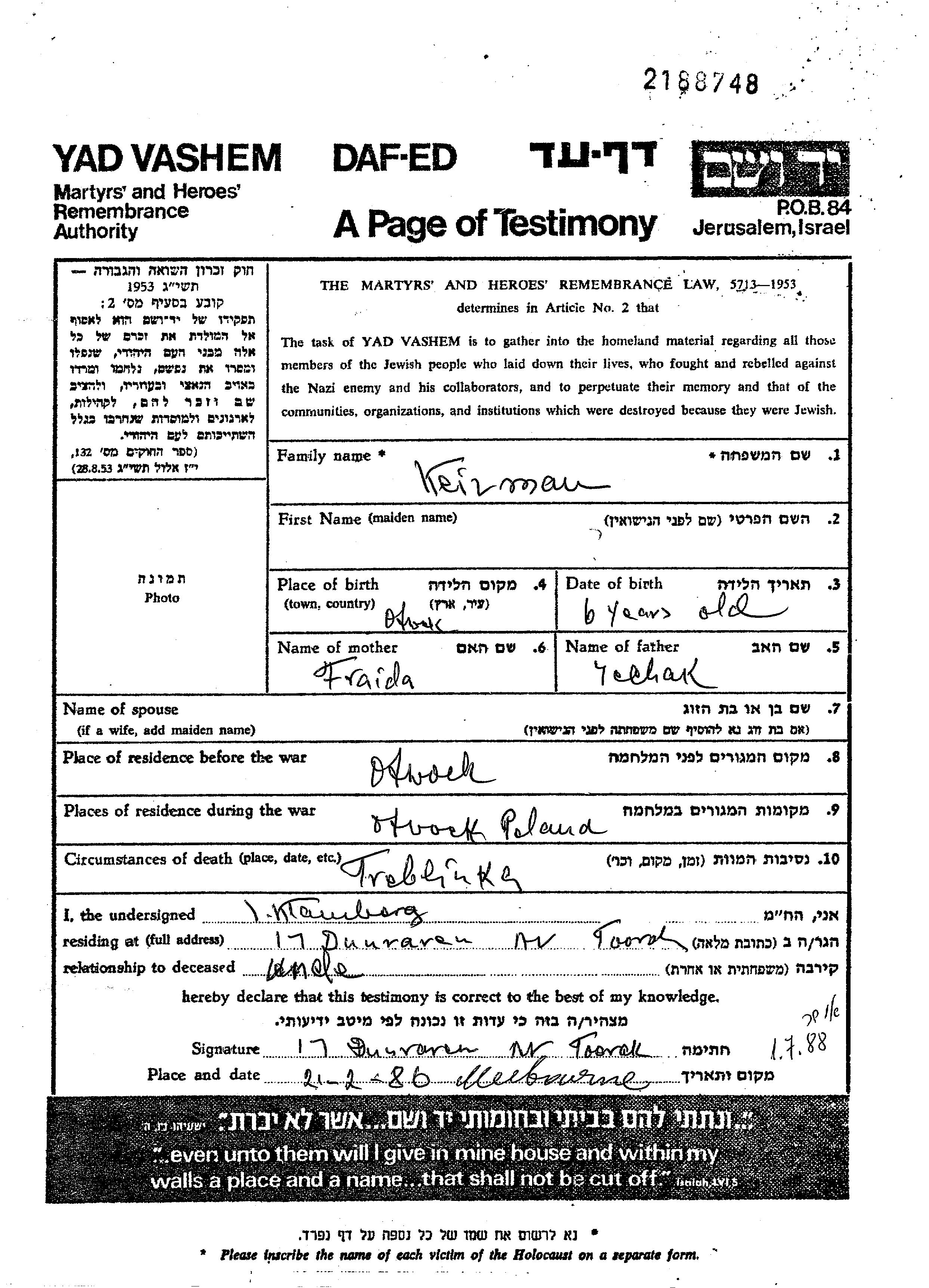 Yad Vashem - Pages of Testimony Names Memorial Collection