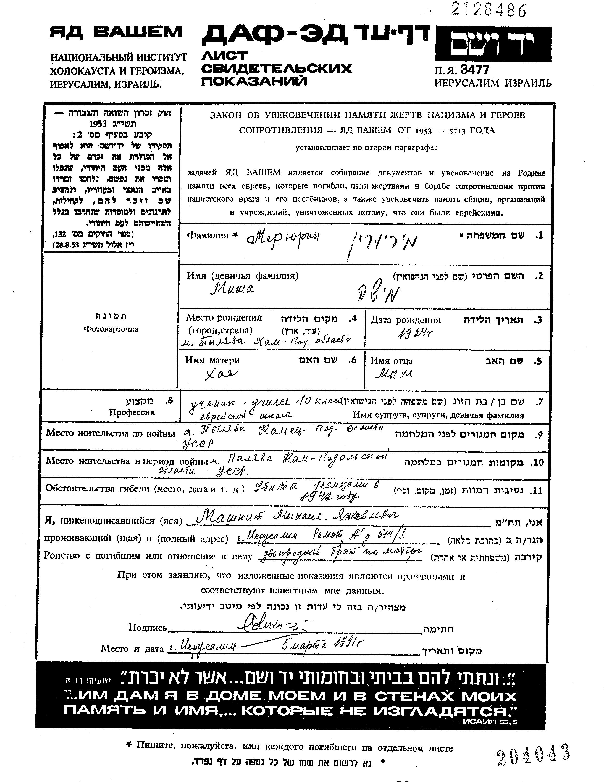 Meryurin Misha 1924 Pilyava, Ukraine (USSR) Page of Testimony