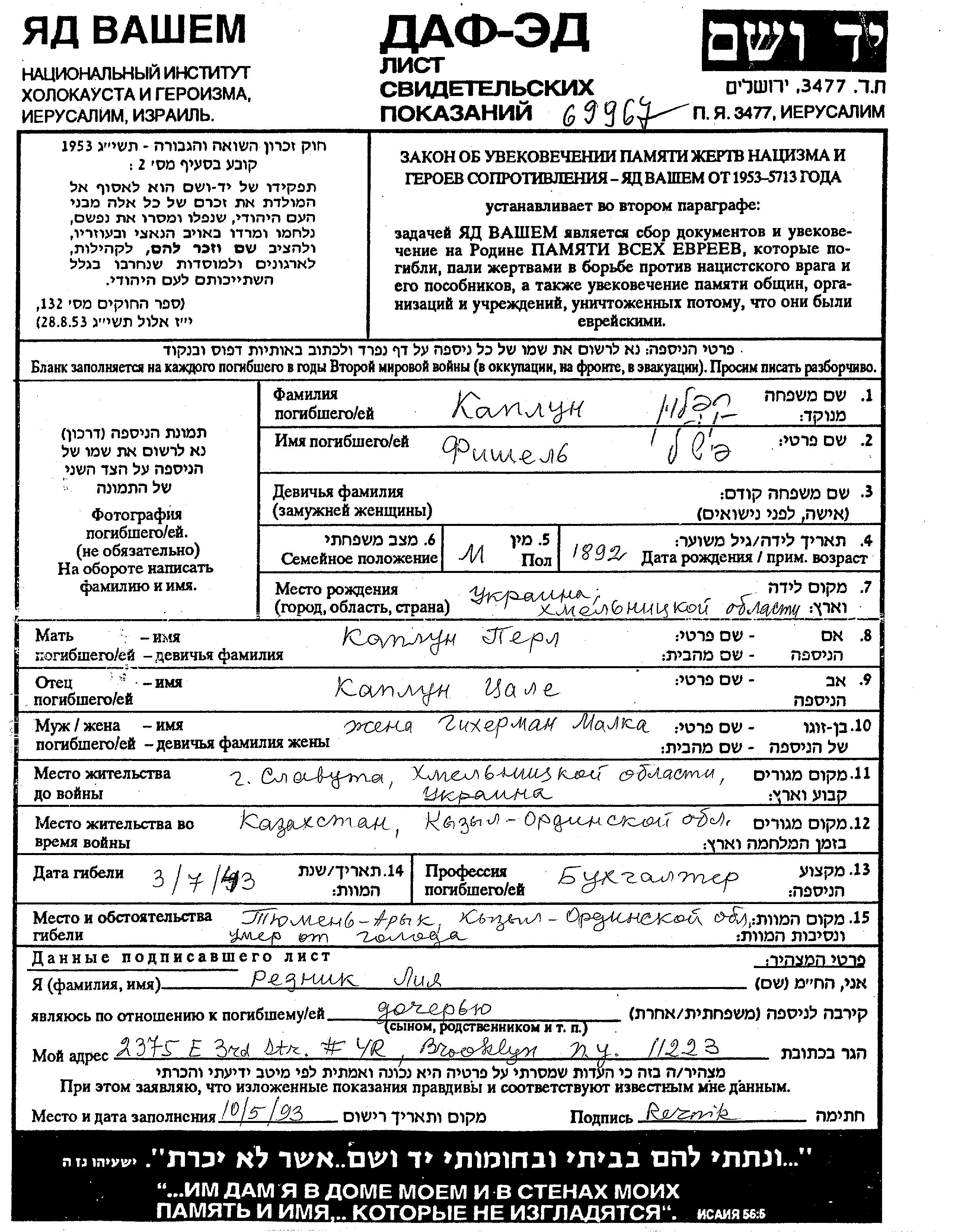 Fishel Kaplun was born in Kamenets Podolskiy, Ukraine (USSR), 1892 to Tzale and Perl. He was a bookkeeper and married to Malka. Prior to WWII he lived in Slavuta, Ukraine (USSR). During the war he was in Tyumen, Russia (USSR). Fishel was murdered in the Shoah. Place of death: Tyumen, Russia (USSR), 03/07/1943.