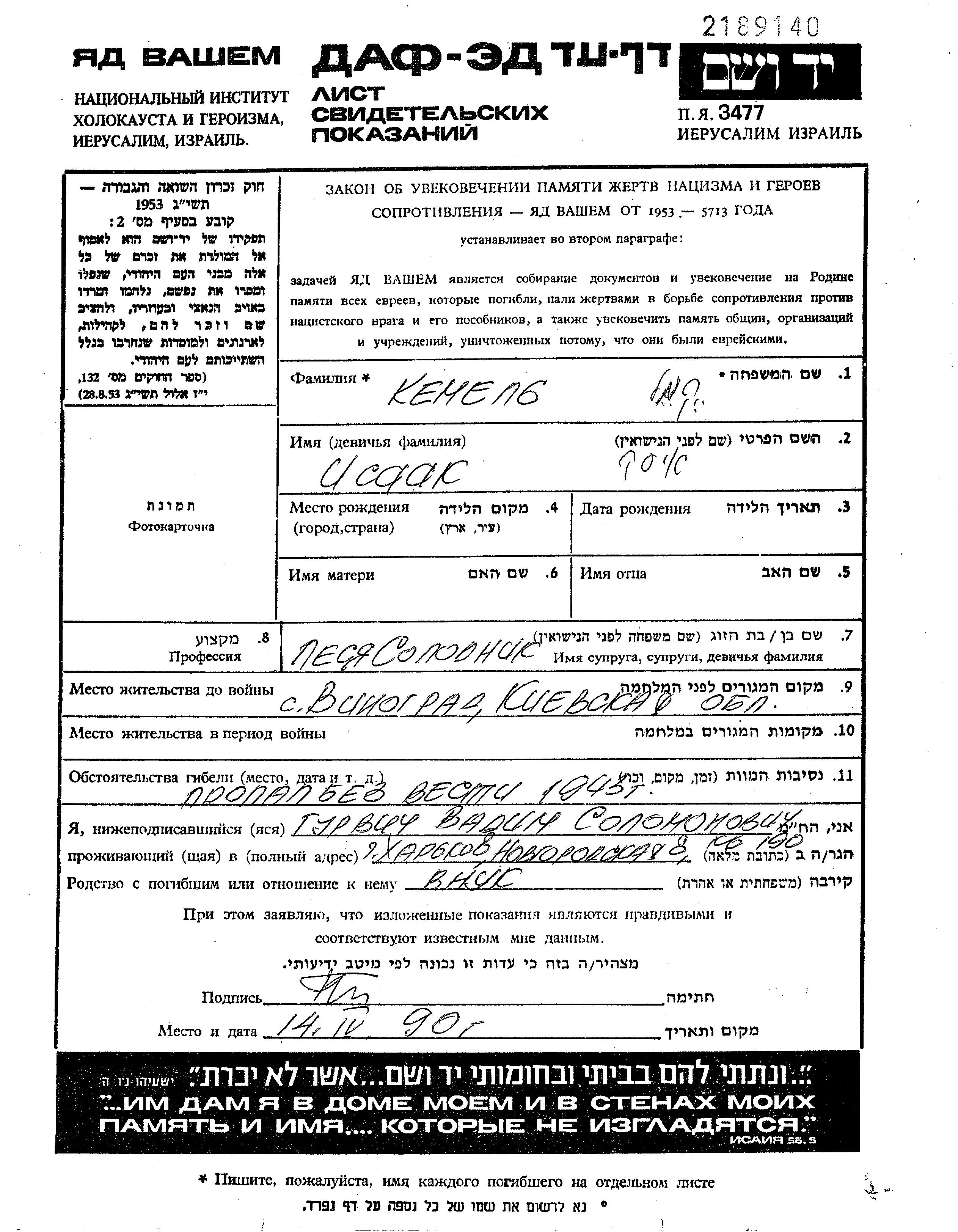Kemel Isaak Vinograd, Ukraine (USSR) Page of Testimony