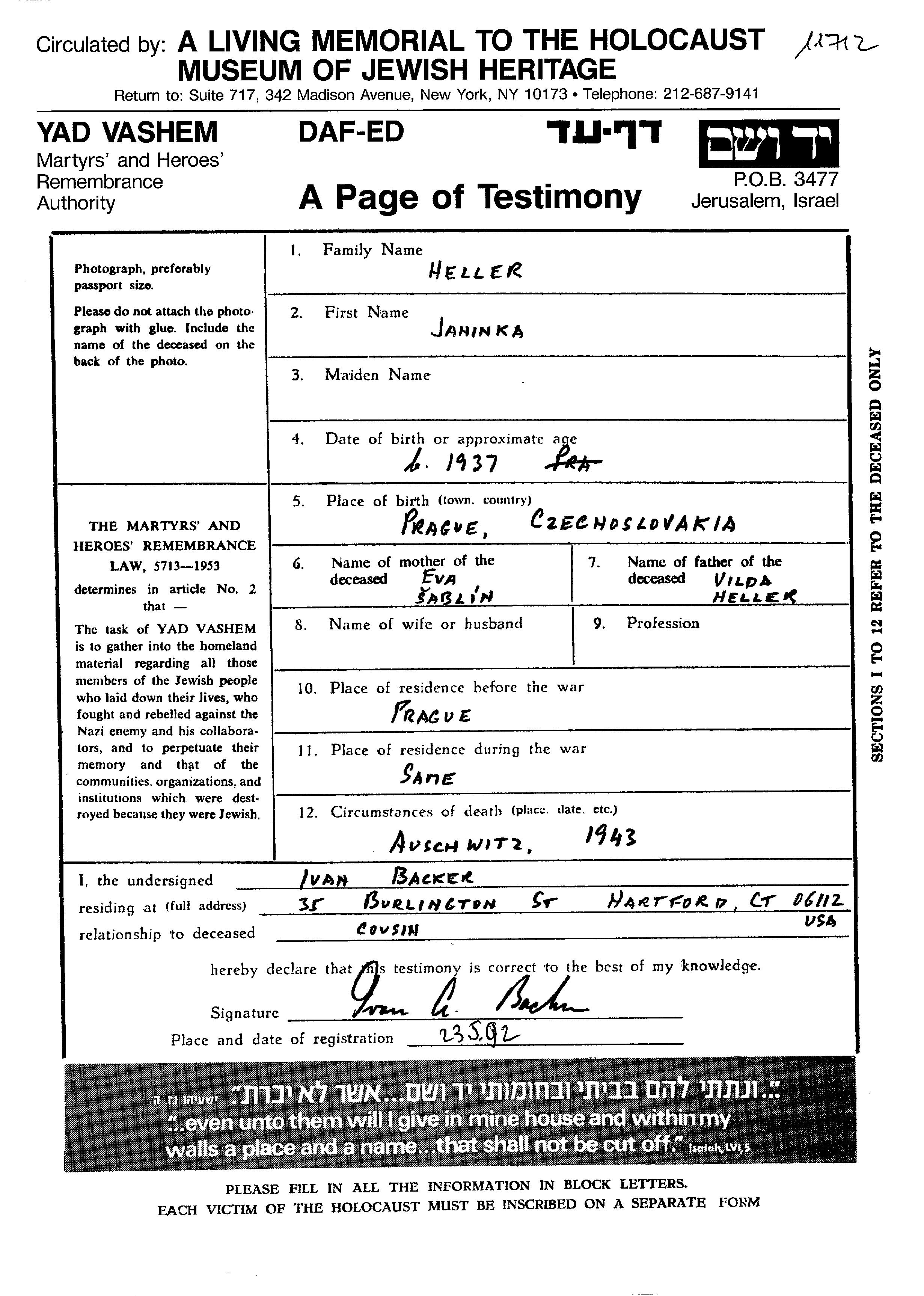 Heller Janinka 1937 Prague, Czechoslovakia Page of Testimony