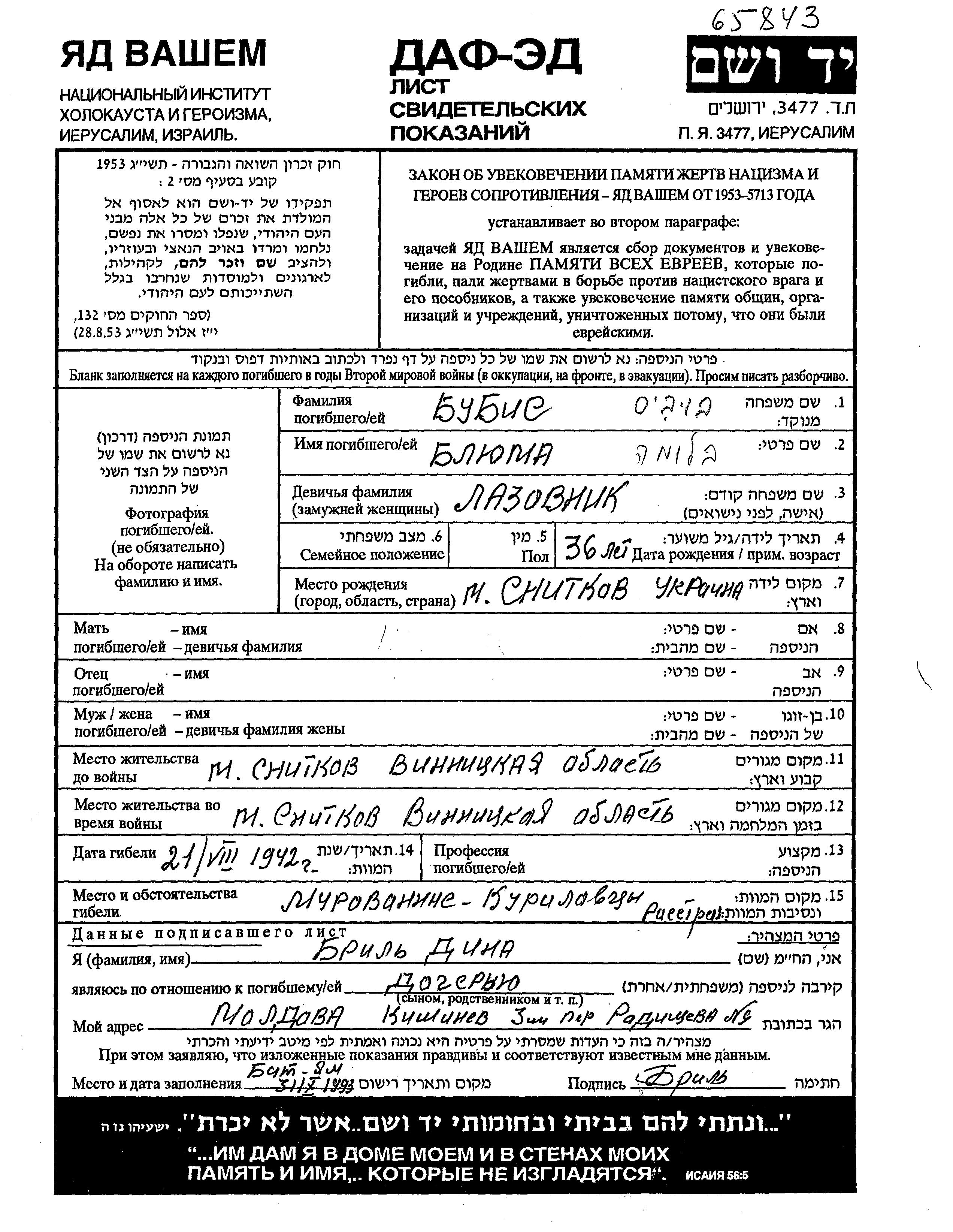 Bliuma Bubis nee Lazovnik was born in Snitkov, Ukraine (USSR), 1906 to Kreinia. She was married. Prior to WWII she lived in Snitkov, Ukraine (USSR). During the war she was in Snitkov, Ukraine (USSR). Bliuma was murdered in the Shoah. Place of death: Mur Kirilovtsy, Ukraine (USSR), 21/08/1942.