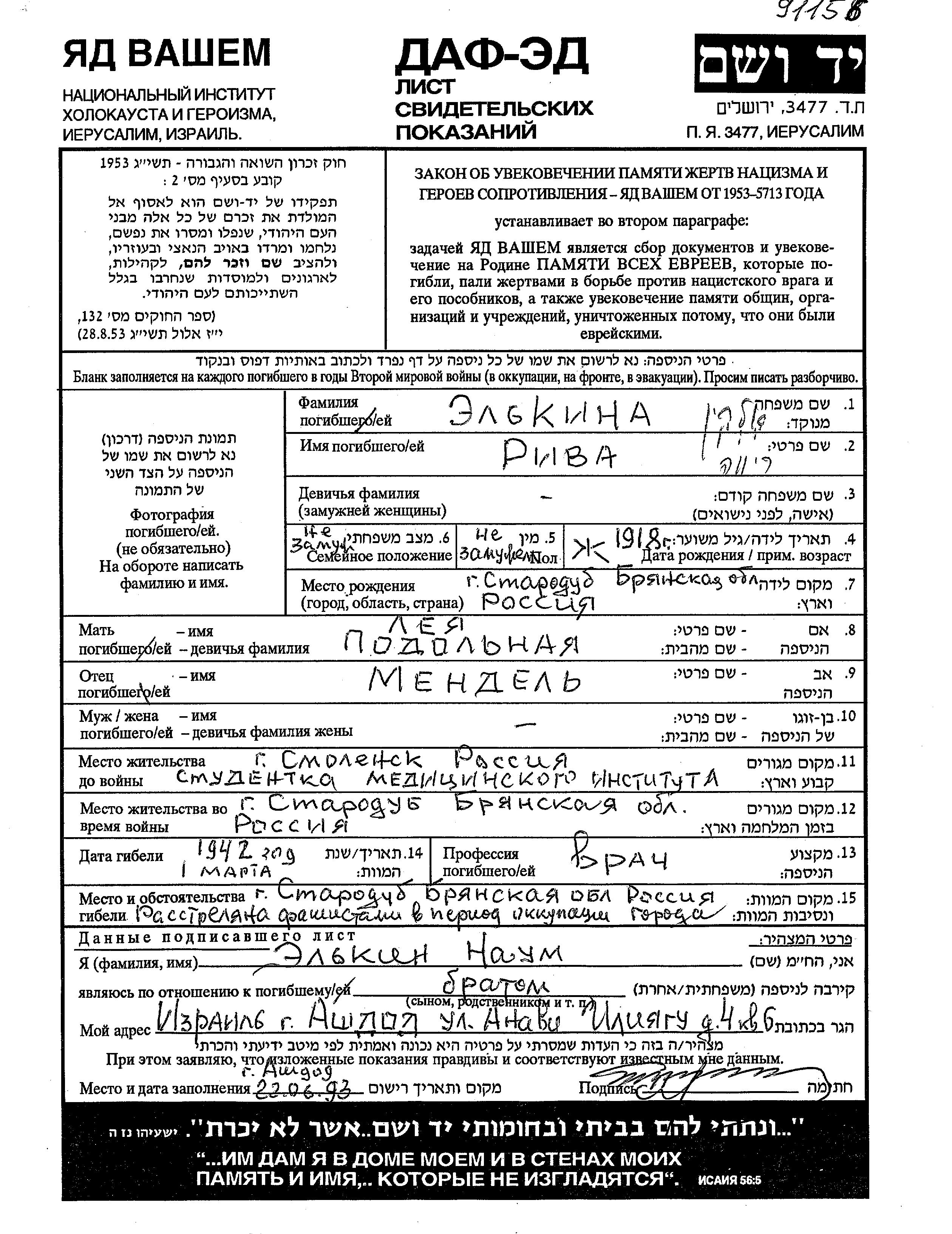 Elkin Riva 1918 Smolensk, Russia (USSR) Page of Testimony