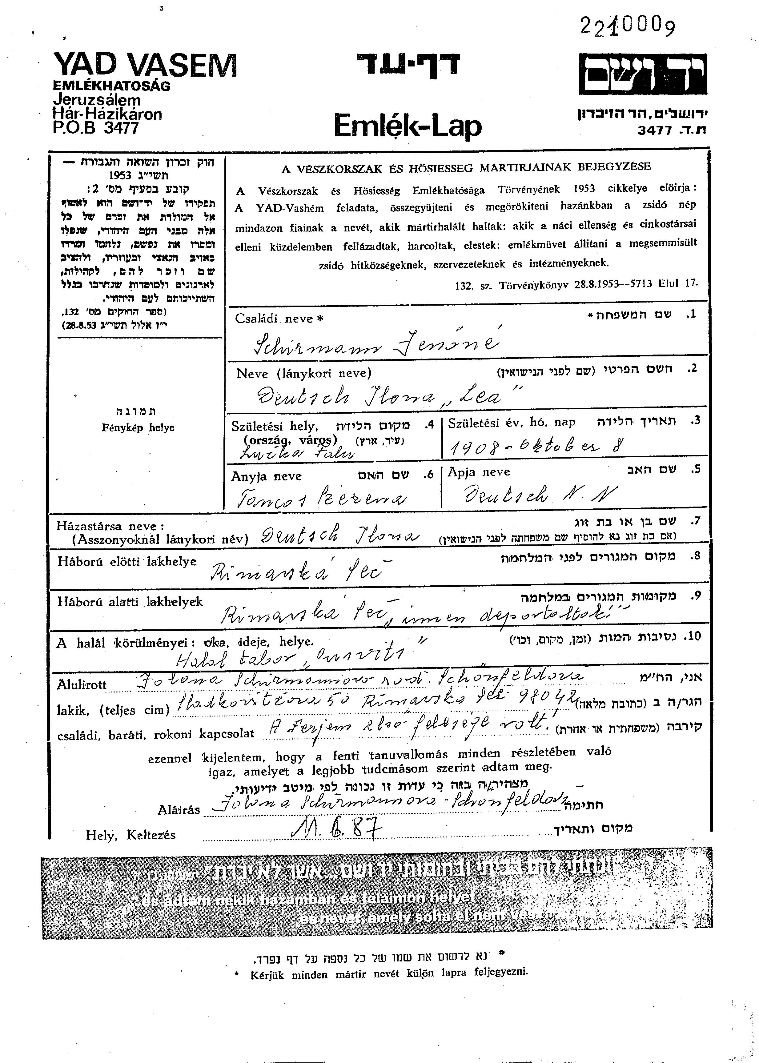 Schirmann Ilona Lea 1908 Rimavska Sec, Czechoslovakia Page of Testimony