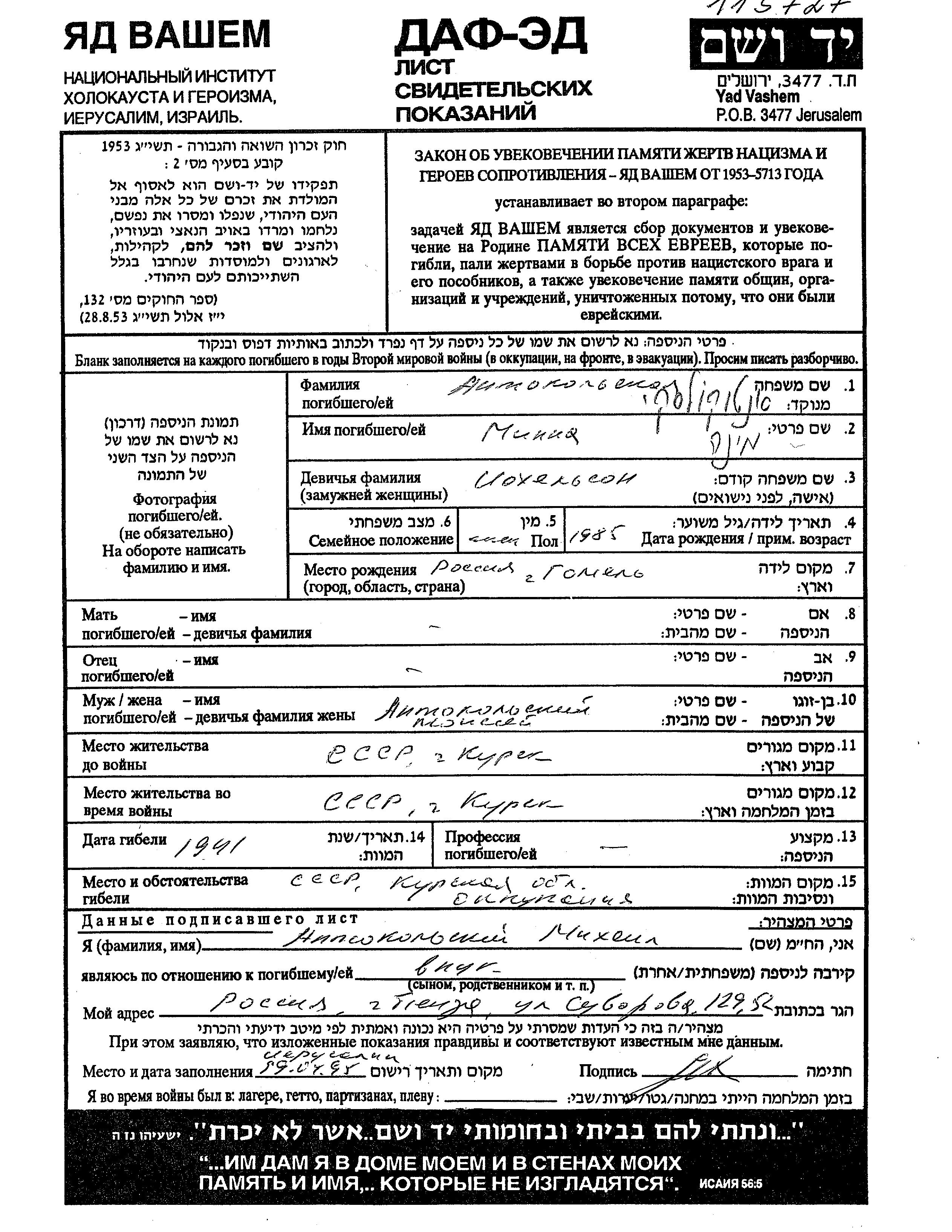 Mina Antokolski nee Iokhelson was born in Gomel, Belorussia (USSR), 1885. She was married to Moisei. Prior to WWII she lived in Kursk, Russia (USSR). During the war she was in Kursk, Russia (USSR). Mina was murdered in the Shoah. Place of death: Kursk, Russia (USSR), 1941.