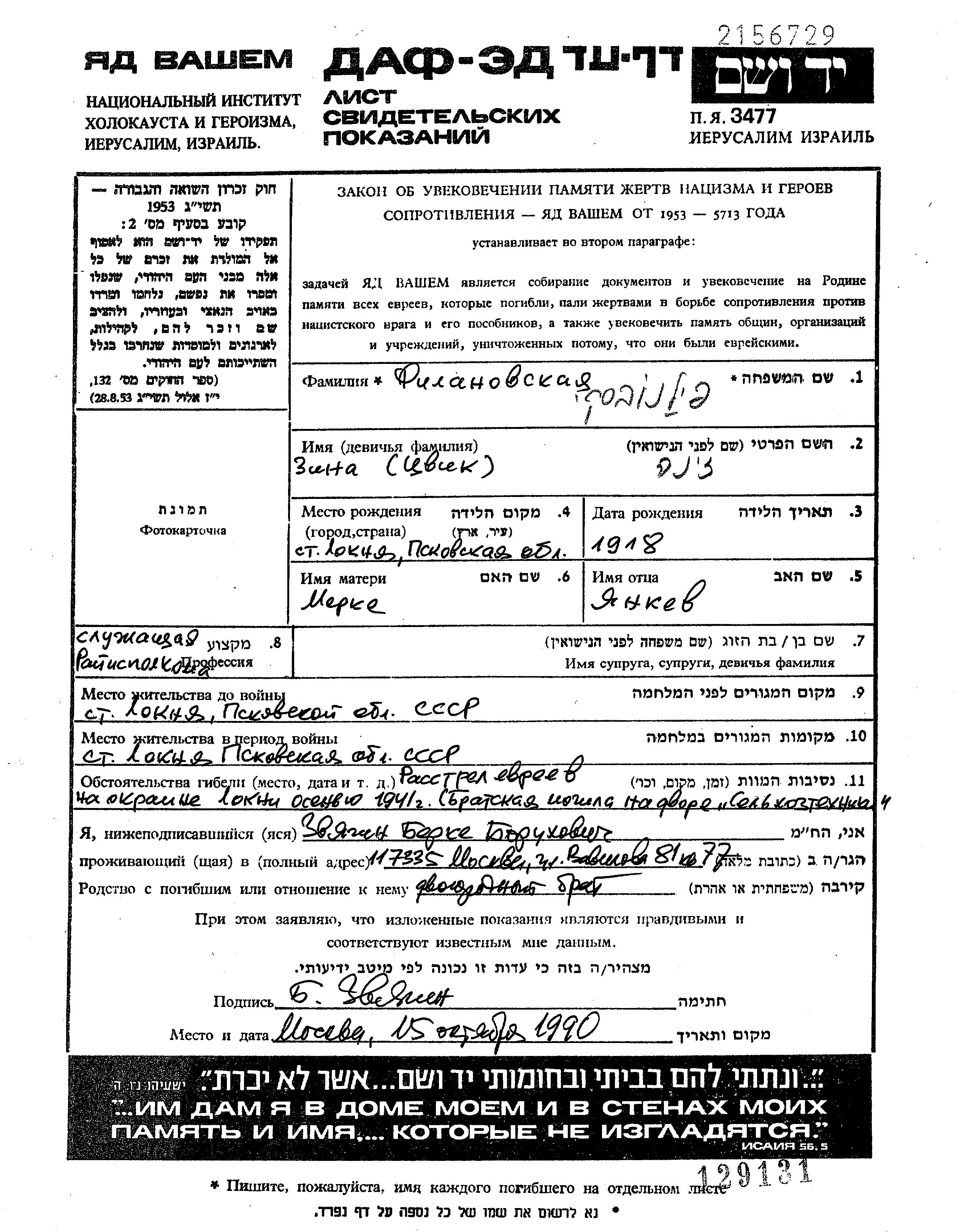 Zina Filanovskaya nee Tzvik was born in Loknya, Russia (USSR), 1918 to Yankev and Merke. She was a clerk. Prior to WWII she lived in Loknya, Russia (USSR). During the war she was in Loknya, Russia (USSR). Zina was murdered in the Shoah. Place of death: Loknya, Russia (USSR), 1941.