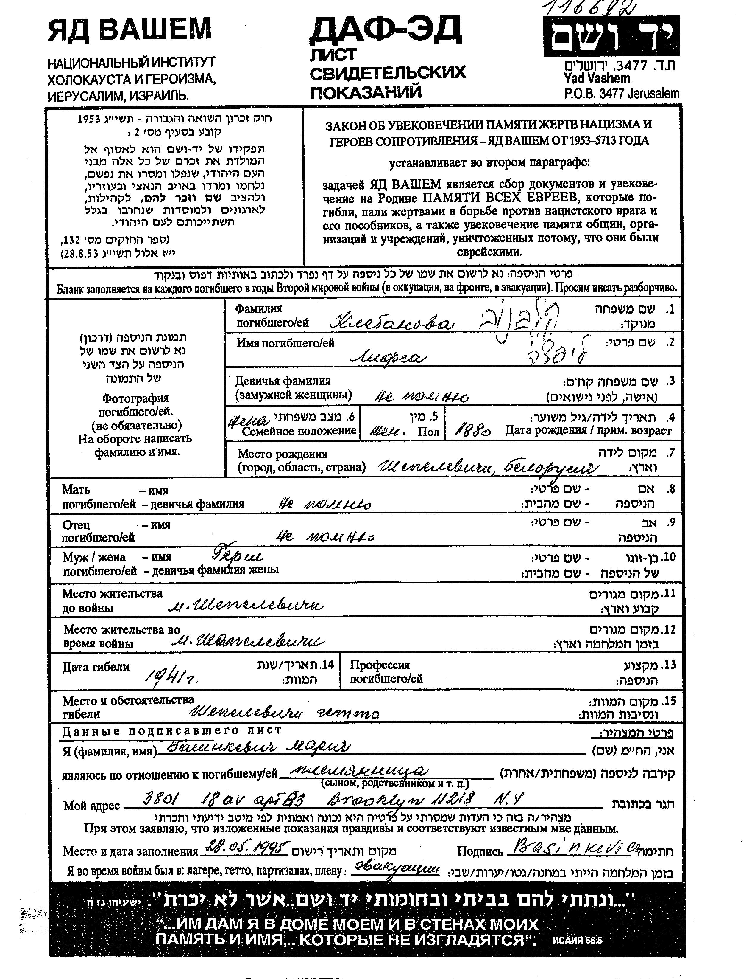 Lifsa Klebanov was born in Shepelevichi, Belorussia (USSR), 1880. She was married to Gersh. Prior to WWII she lived in Shepelevichi, Belorussia (USSR). During the war she was in Shepelevichi, Belorussia (USSR). Lifsa was murdered in the Shoah. Place of death: Shepelevichi, Belorussia (USSR), 1941.