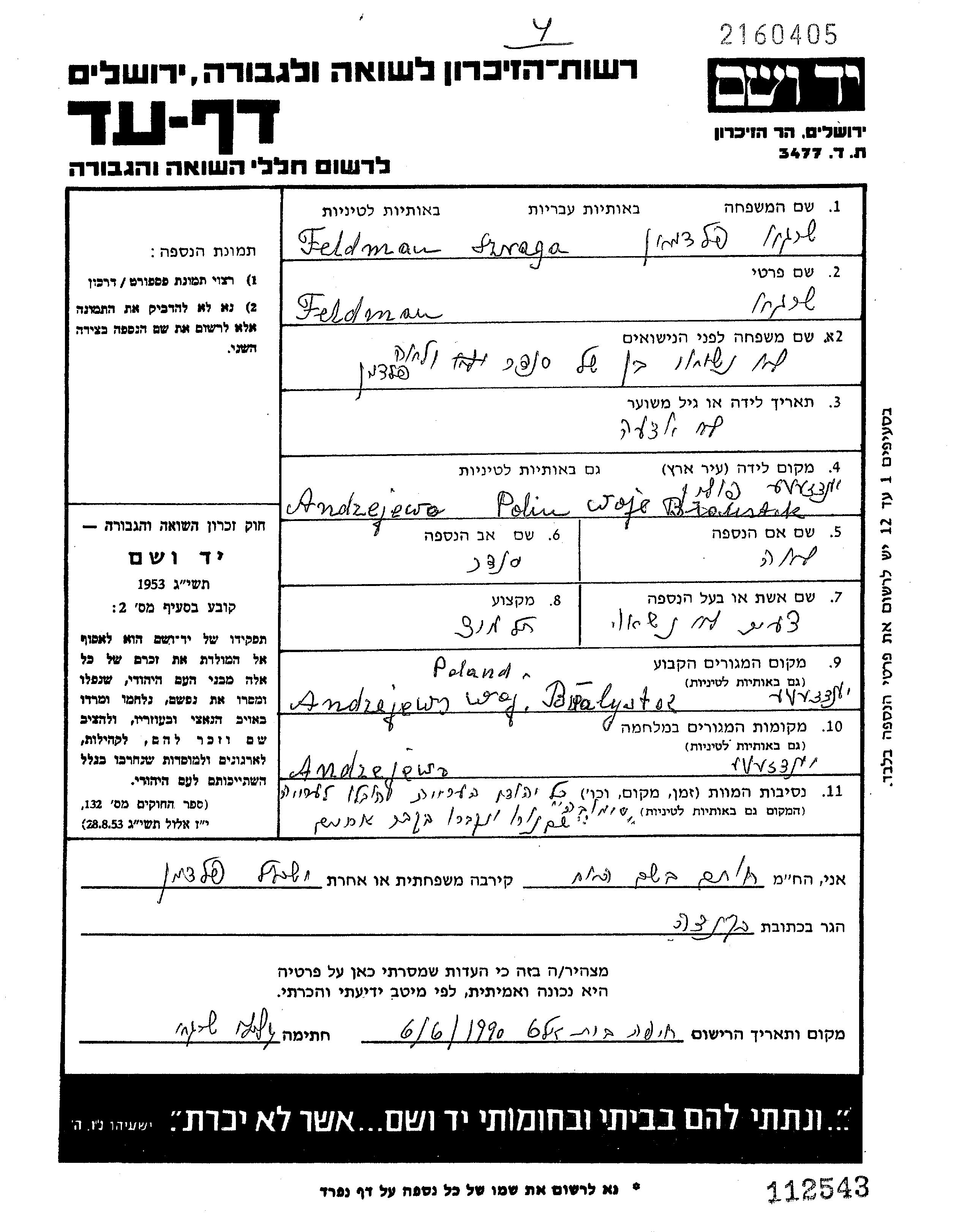 Szraga Feldman was born in Andrzejewo, Poland to Sender and Lea nee Lewinski. He was a pupil and child. Prior to WWII he lived in Andrzejewo, Poland. During the war he was in Andrzejewo, Poland. Szraga was murdered in the Shoah. Place of death: Szumowo, Poland.