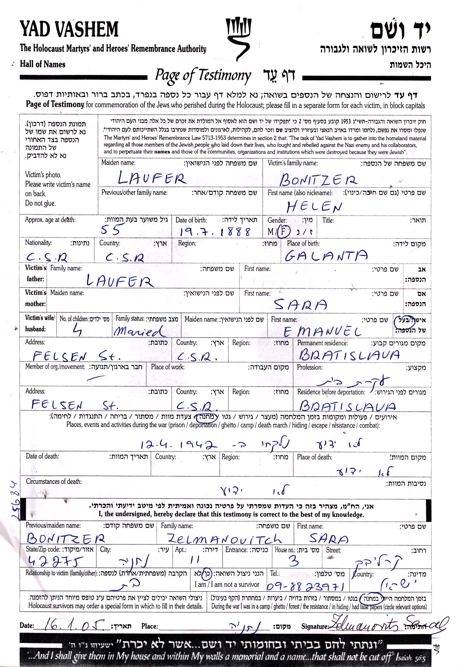| Bonitzer | Helen | 1888 | Bratislava, Czechoslovakia | Page of Testimony |
