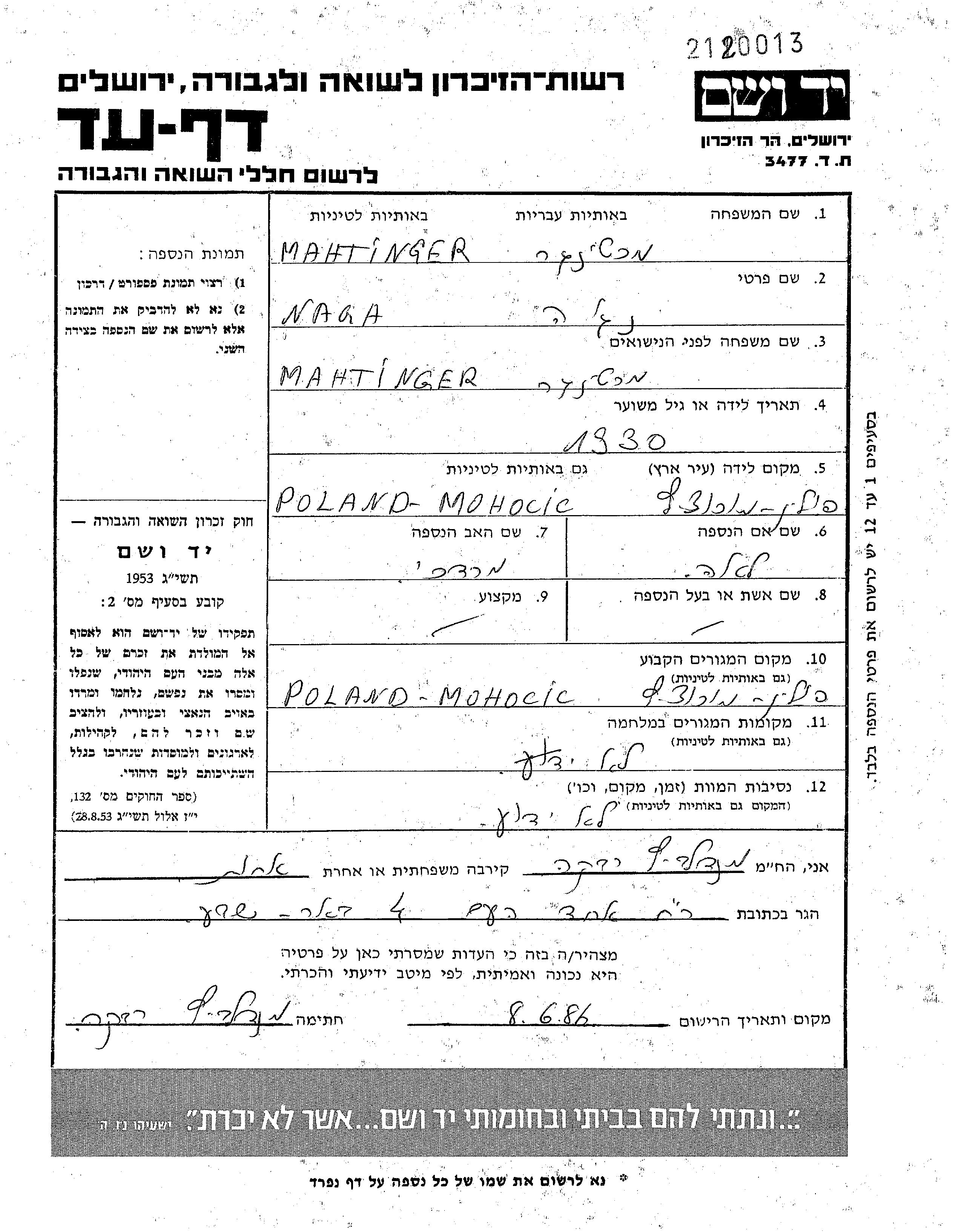 Mahtinger Noga Naga 1930 Marchocice, Poland Page of Testimony