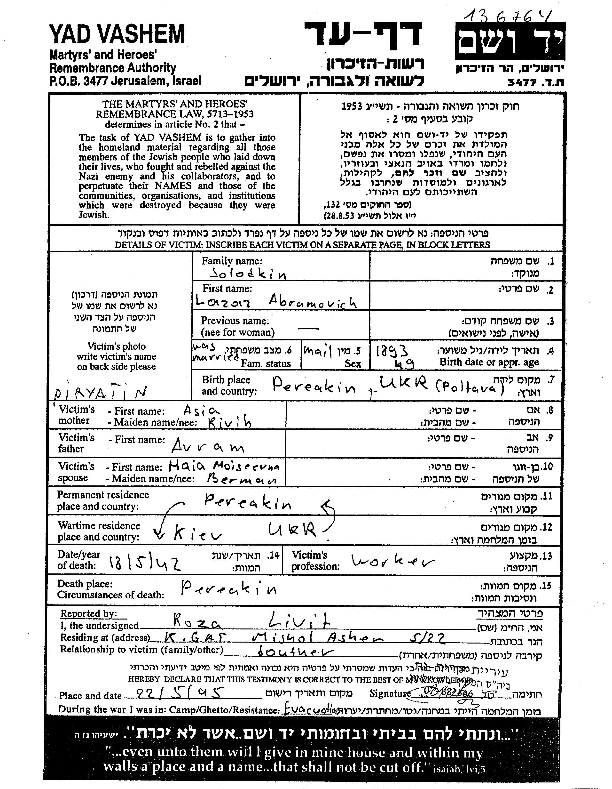 Solodkin Lazar 1893 Kiyev, Ukraine (USSR) Page of Testimony