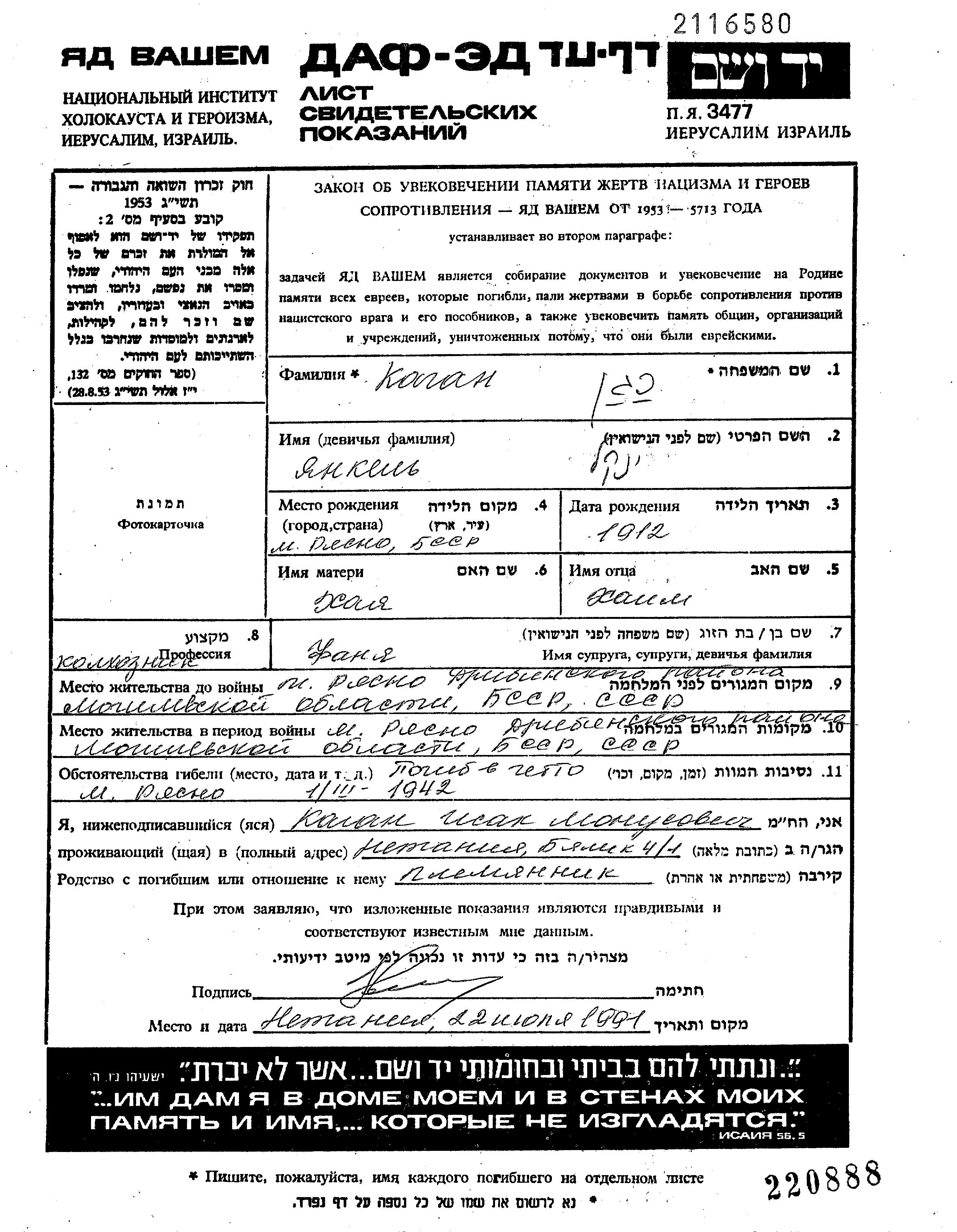 Kagan Yankel Ryasna, Belorussia (USSR) Page of Testimony