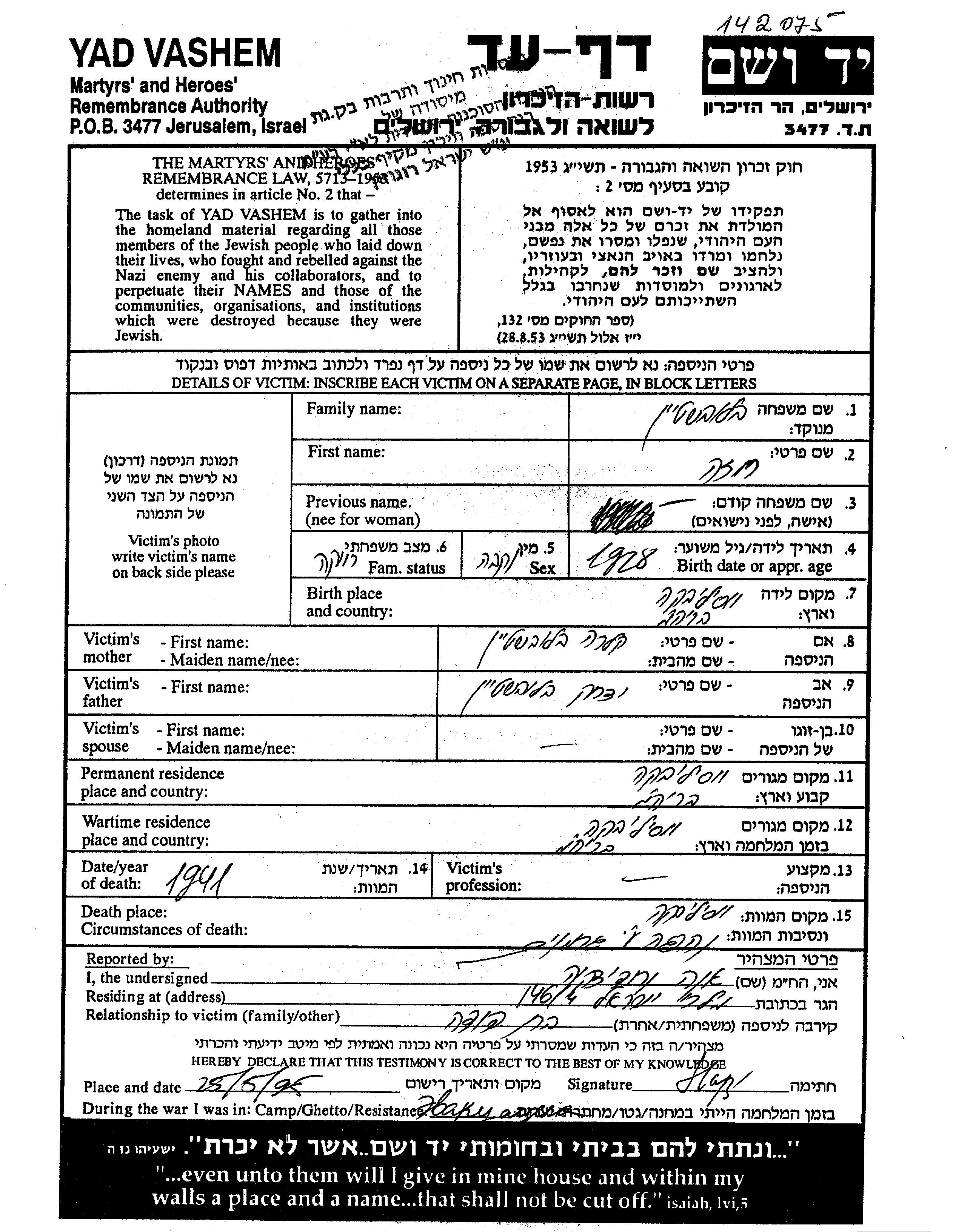 Roza Bluvshtein was born in Vasilyevka, Ukraine (USSR), 1928 to Ytzkhak and Klara. She was child. Prior to WWII she lived in Vasilyevka, Ukraine (USSR). During the war she was in Vasilyevka, Ukraine (USSR). Roza was murdered in the Shoah. Place of death: Vasilyevka, Ukraine (USSR), 1941.