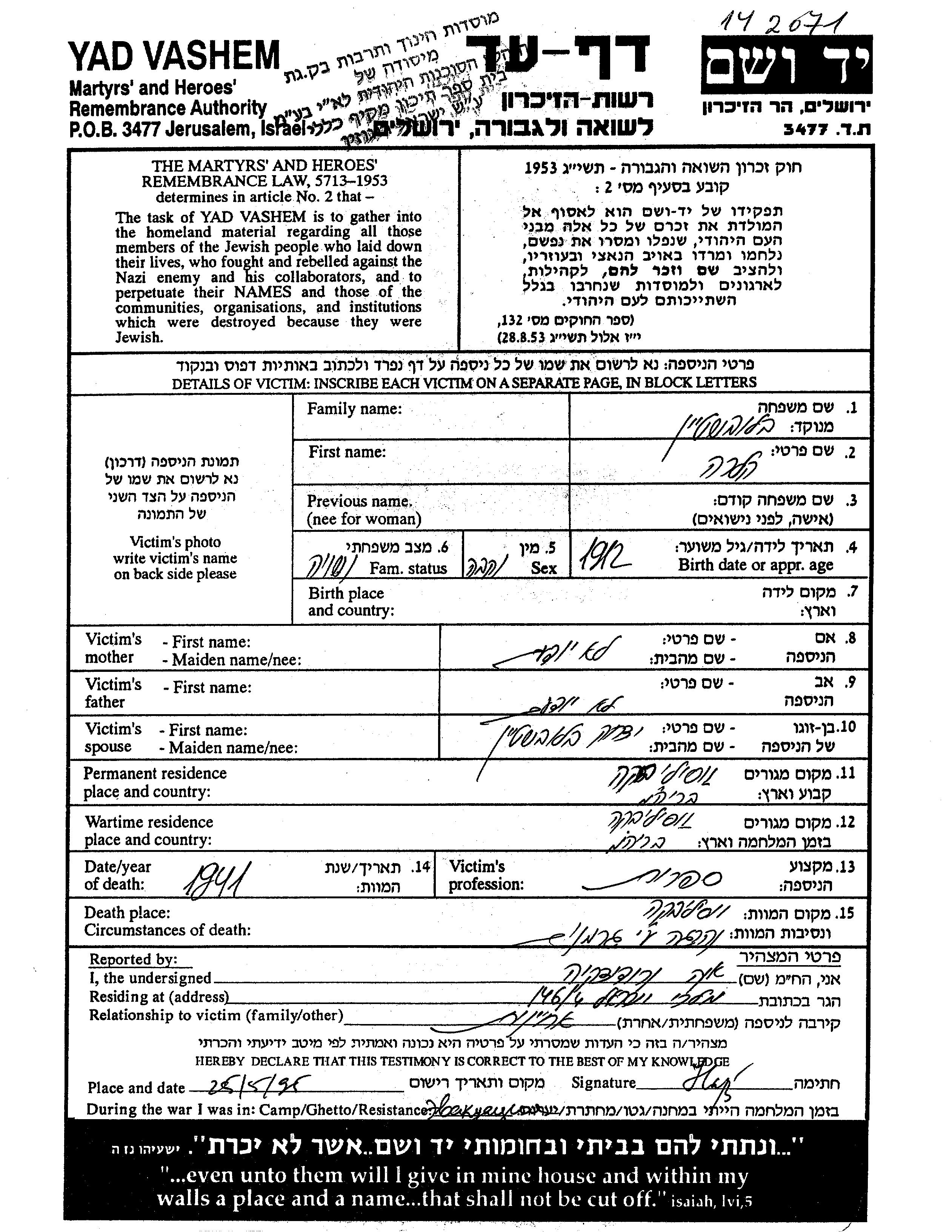 Klara Bluvshtein was born, 1912. She was a hairdresser and married to Ytzkhak. Prior to WWII she lived in Vasilyevka, Ukraine (USSR). During the war she was in Vasilyevka, Ukraine (USSR). Klara was murdered in the Shoah. Place of death: Vasilyevka, Ukraine (USSR), 1941.