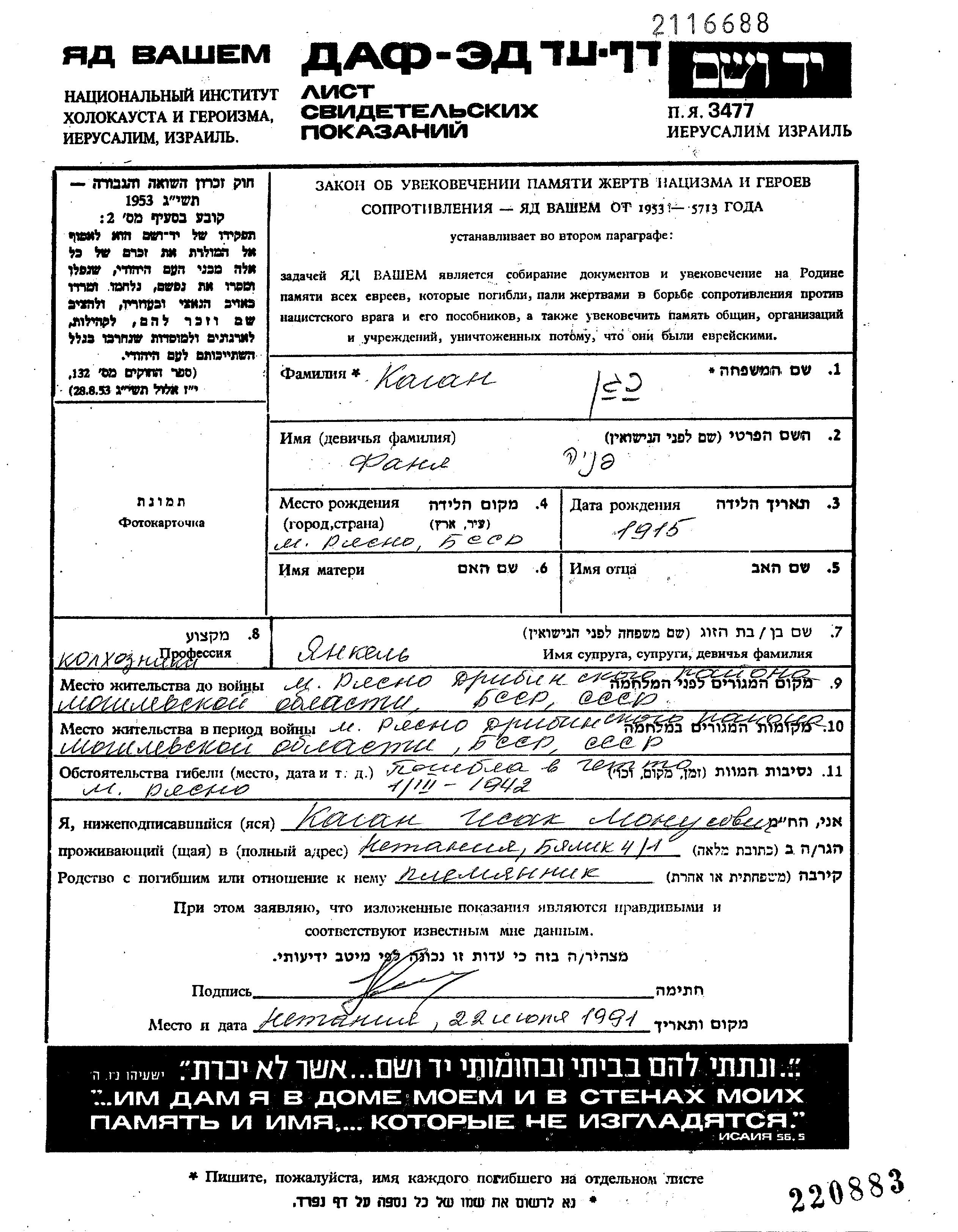 Kagan Fanya Ryasna, Belorussia (USSR) Page of Testimony