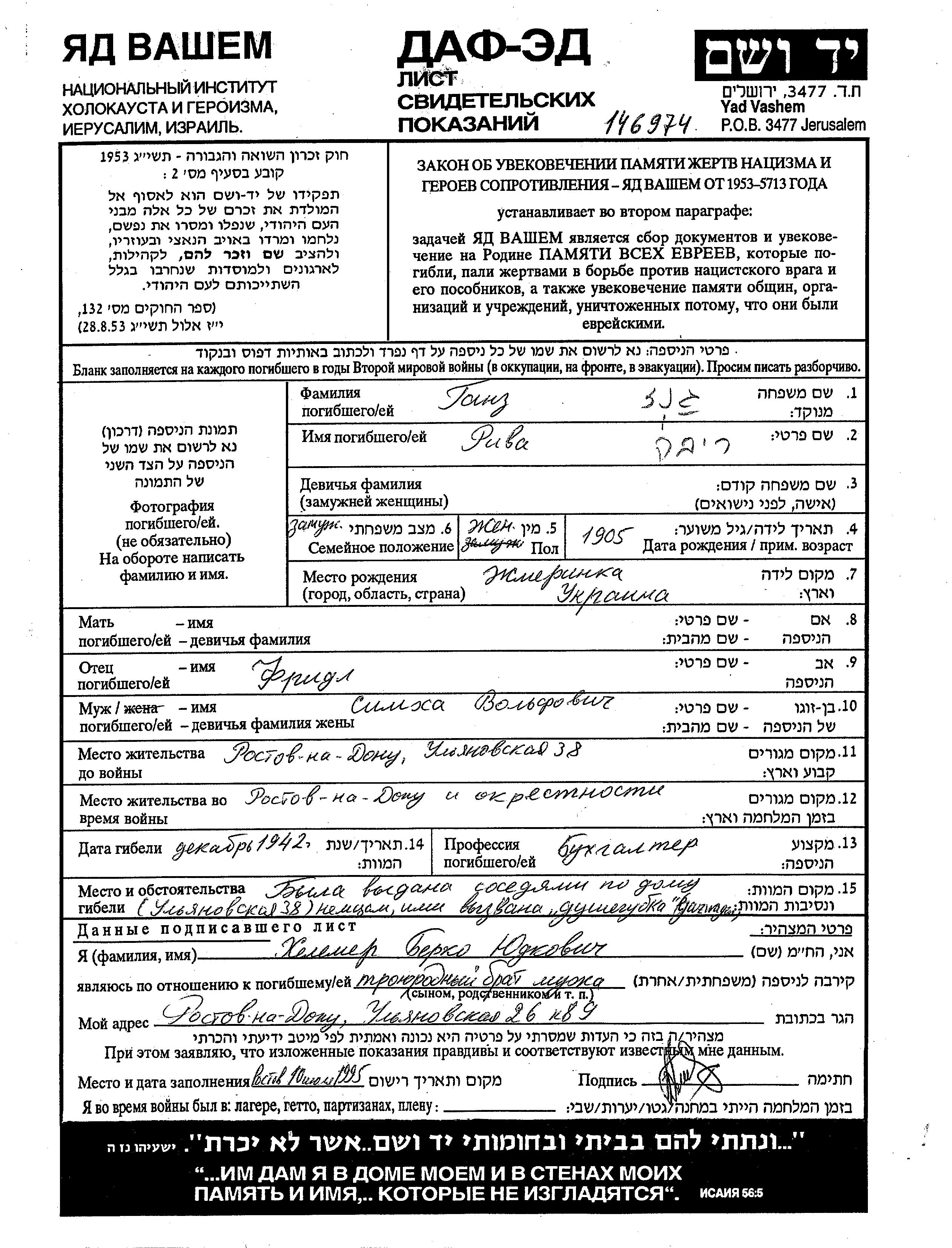 Ganz Riva 1905 Rostov, Russia (USSR) Page of Testimony