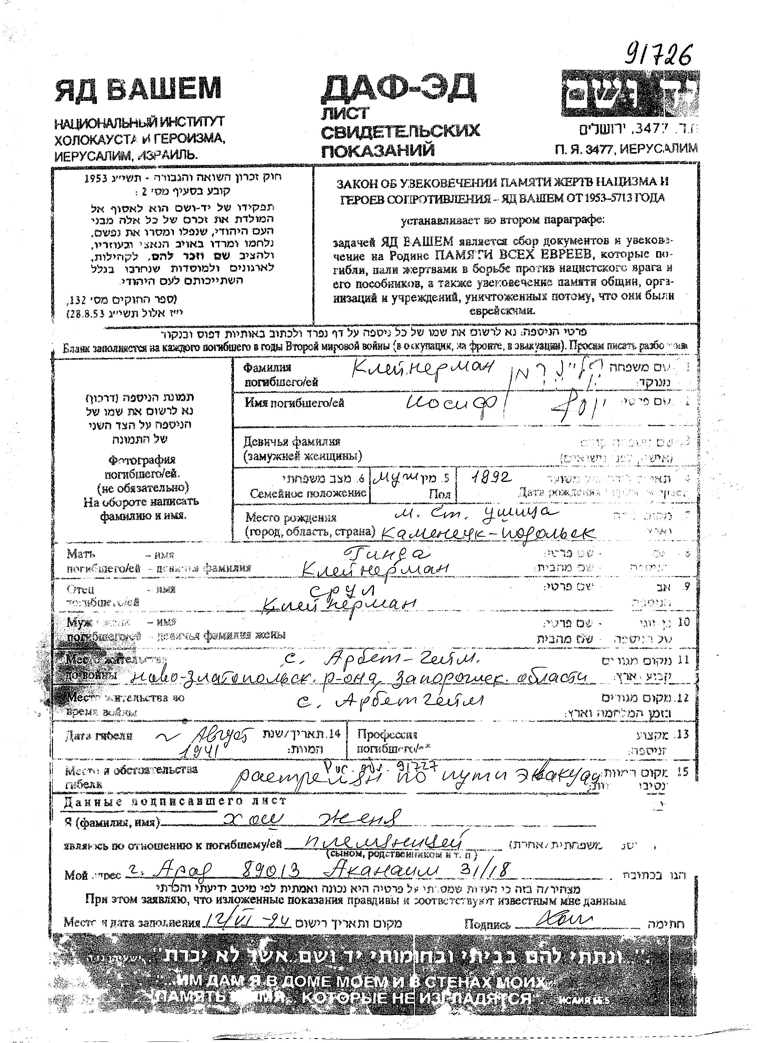 Iosif Kleynerman was born in Staraya Ushitsa, Ukraine (USSR), 1892 to Srul and Ginda. Prior to WWII he lived in Arbeytgeym, Ukraine (USSR). During the war he was in Arbeytgeym, Ukraine (USSR). Iosif was murdered in the Shoah. Place of death: Rostov na Donu, Russia (USSR), 1941.