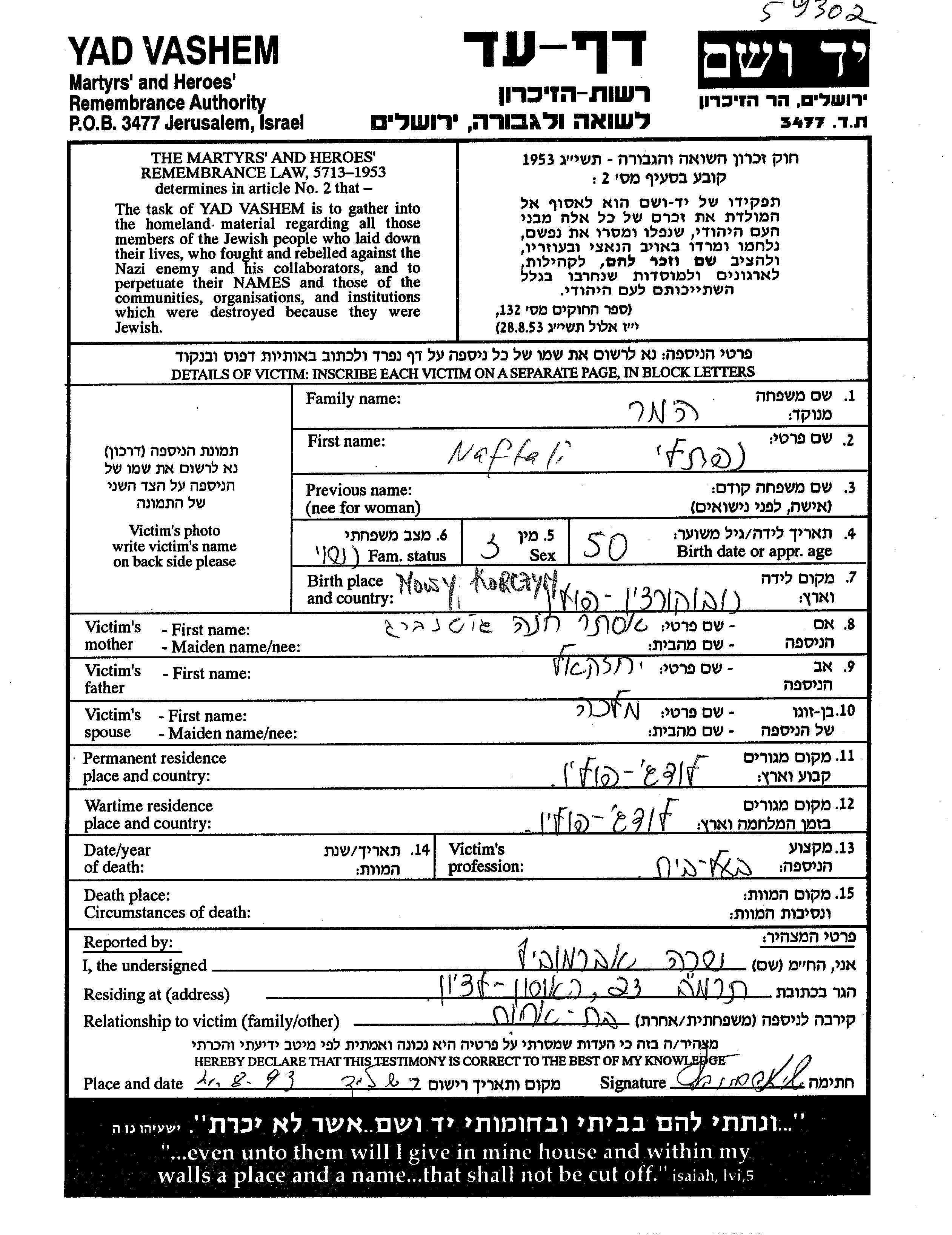 Hamer Naftali Lodz, Poland Page of Testimony