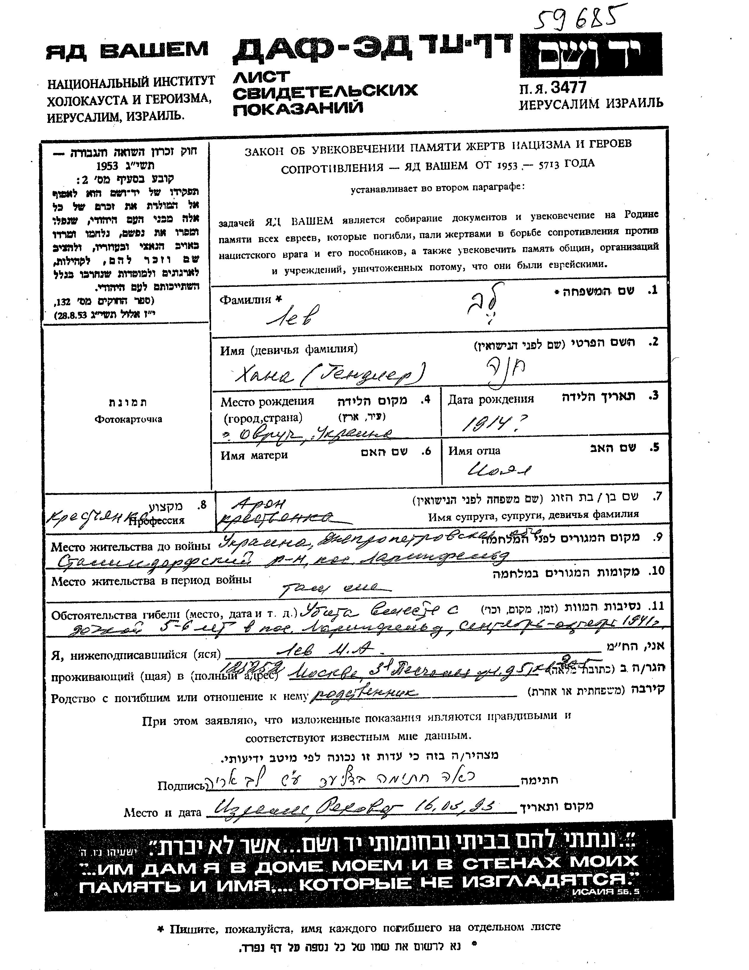 Khana Lev nee Gandler was born in Ovruch, Ukraine (USSR), 1914 to Yoel. She was an agriculturist and married to Aron. Prior to WWII she lived in Larinfeld, Ukraine (USSR). During the war she was in Larinfeld, Ukraine (USSR). Khana was murdered in the Shoah. Place of death: Larinfeld, Ukraine (USSR), 1941.