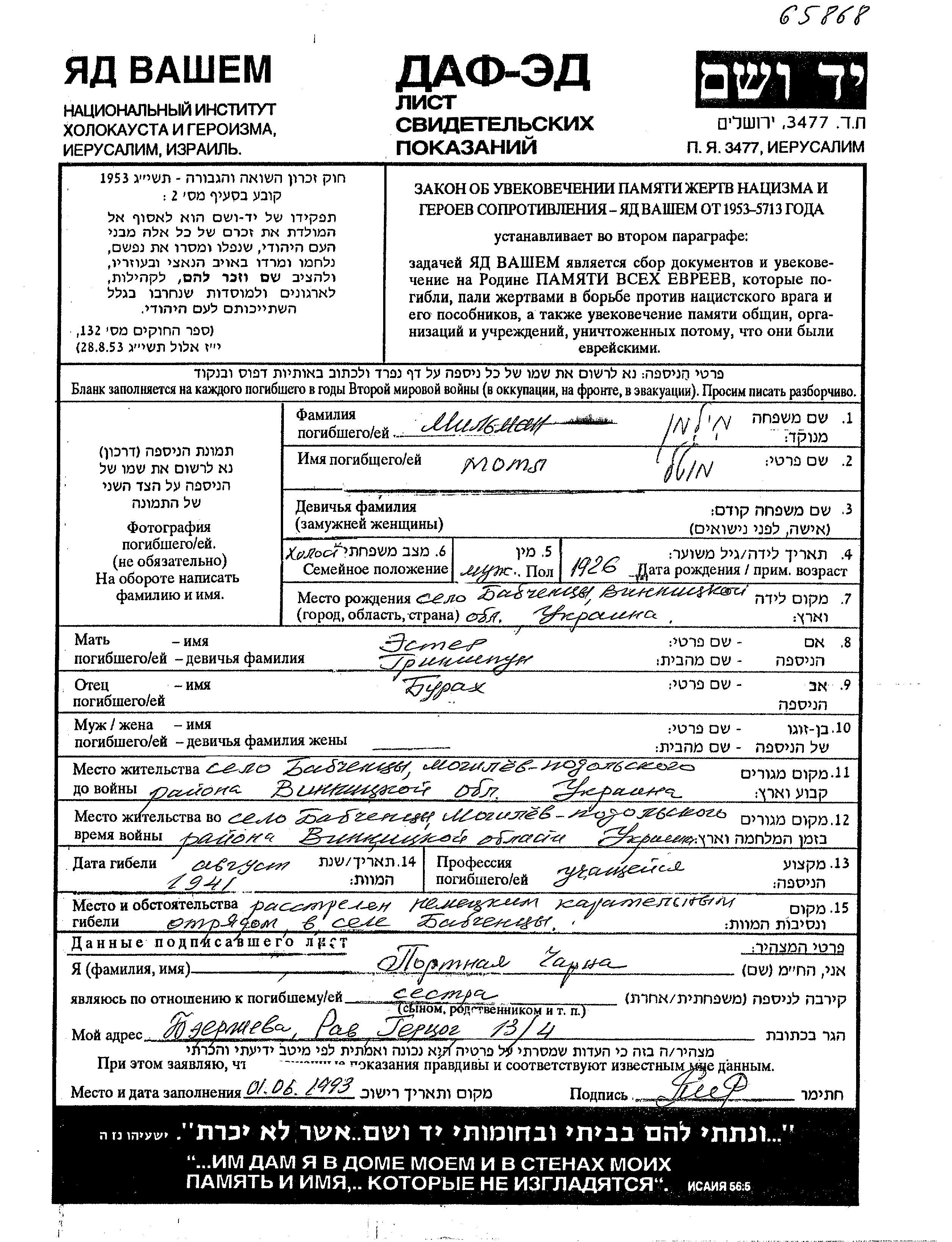 Milman Motl 1926 Babchintsy, Ukraine (USSR) Page of Testimony