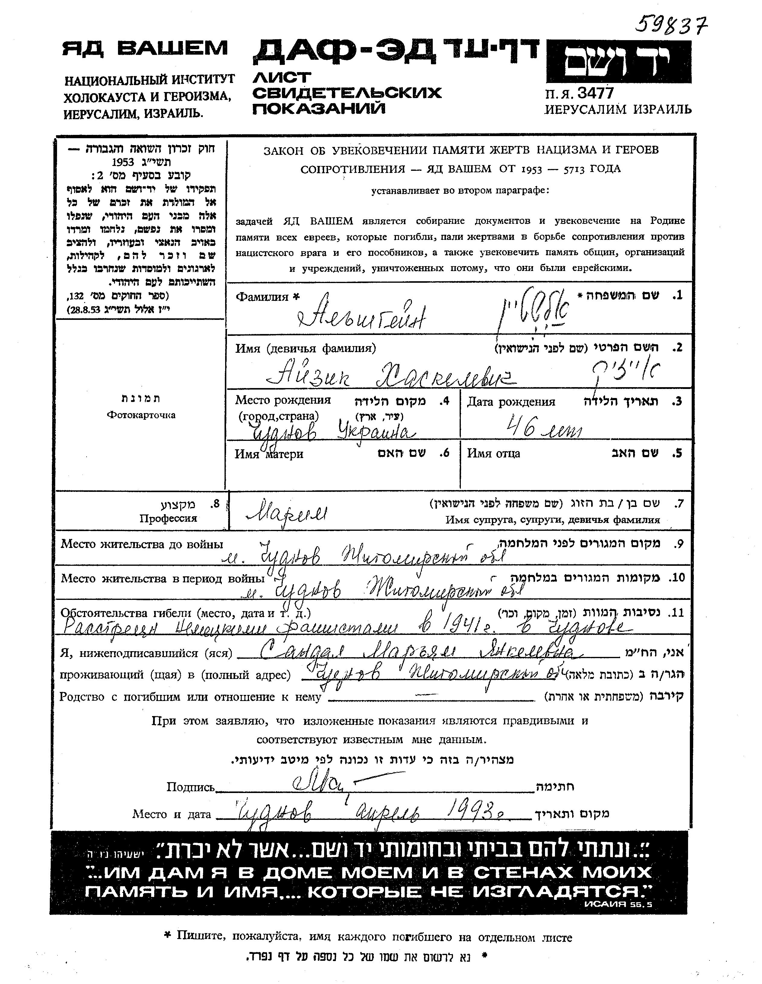 Aizik Alshtein was born in Chudnov, Ukraine (USSR), 1895 to Khaskel. He was married to Marim. Prior to WWII he lived in Chudnov, Ukraine (USSR). During the war he was in Chudnov, Ukraine (USSR). Aizik was murdered in the Shoah. Place of death: Chudnov, Ukraine (USSR), 1941.