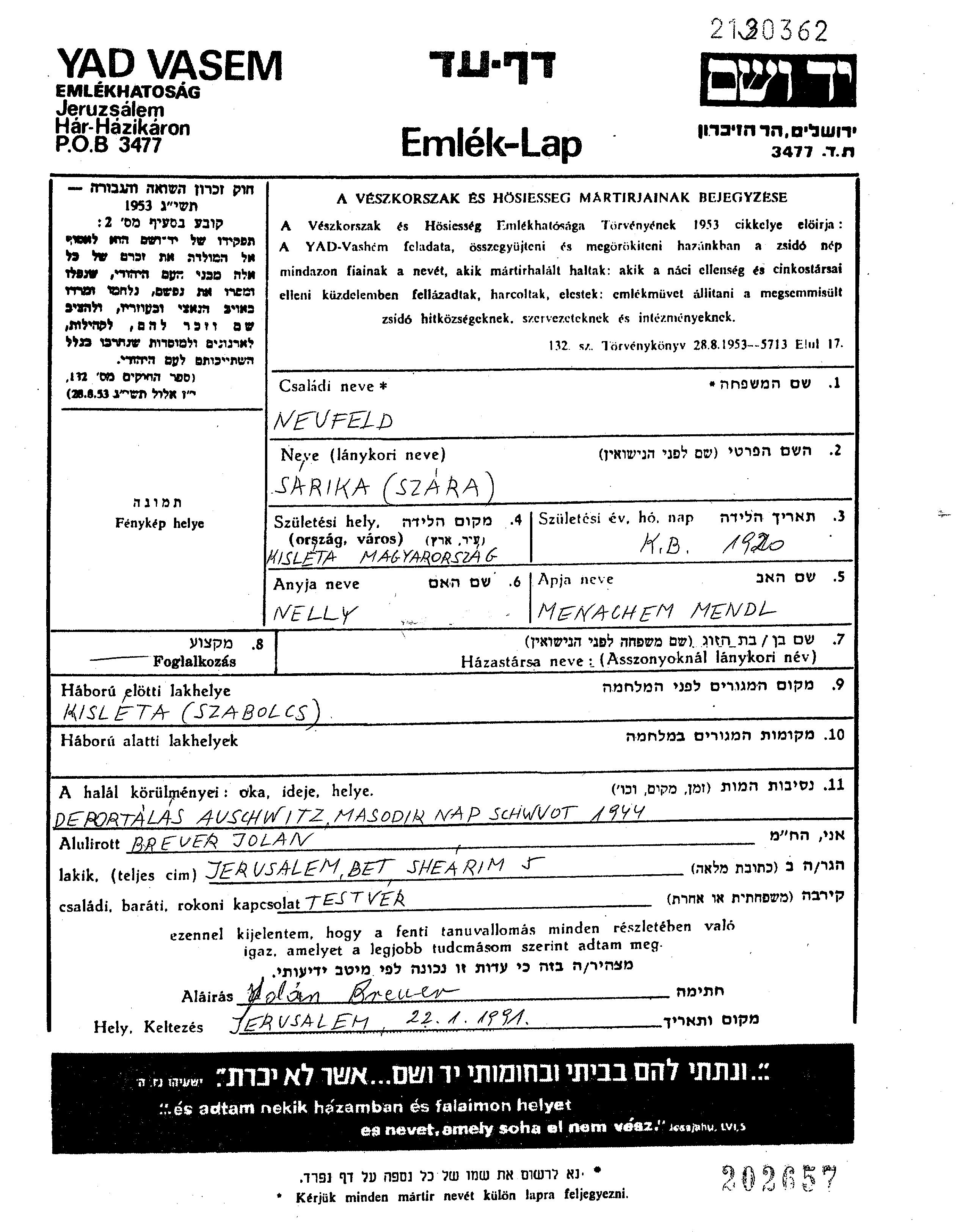 Sarika Neufeld was born in Kisleta, Hungary, 1920 to Menachem Mendl and Nelly nee Schoenberger. Prior to WWII she lived in Kisleta, Hungary. During the war she was in Kisleta, Hungary.