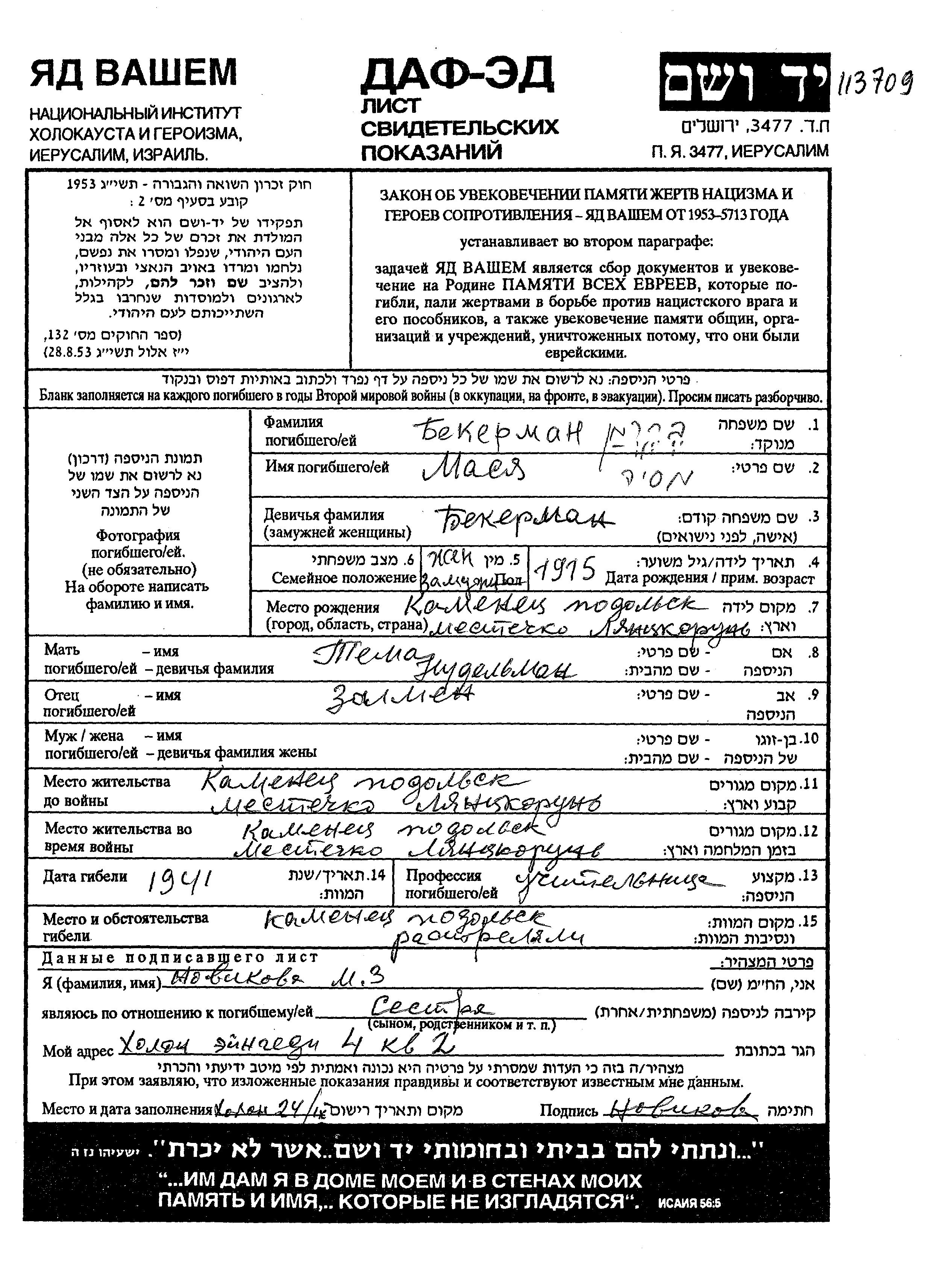 Bekerman Masia 1915 Laskorun, Ukraine (USSR) Page of Testimony