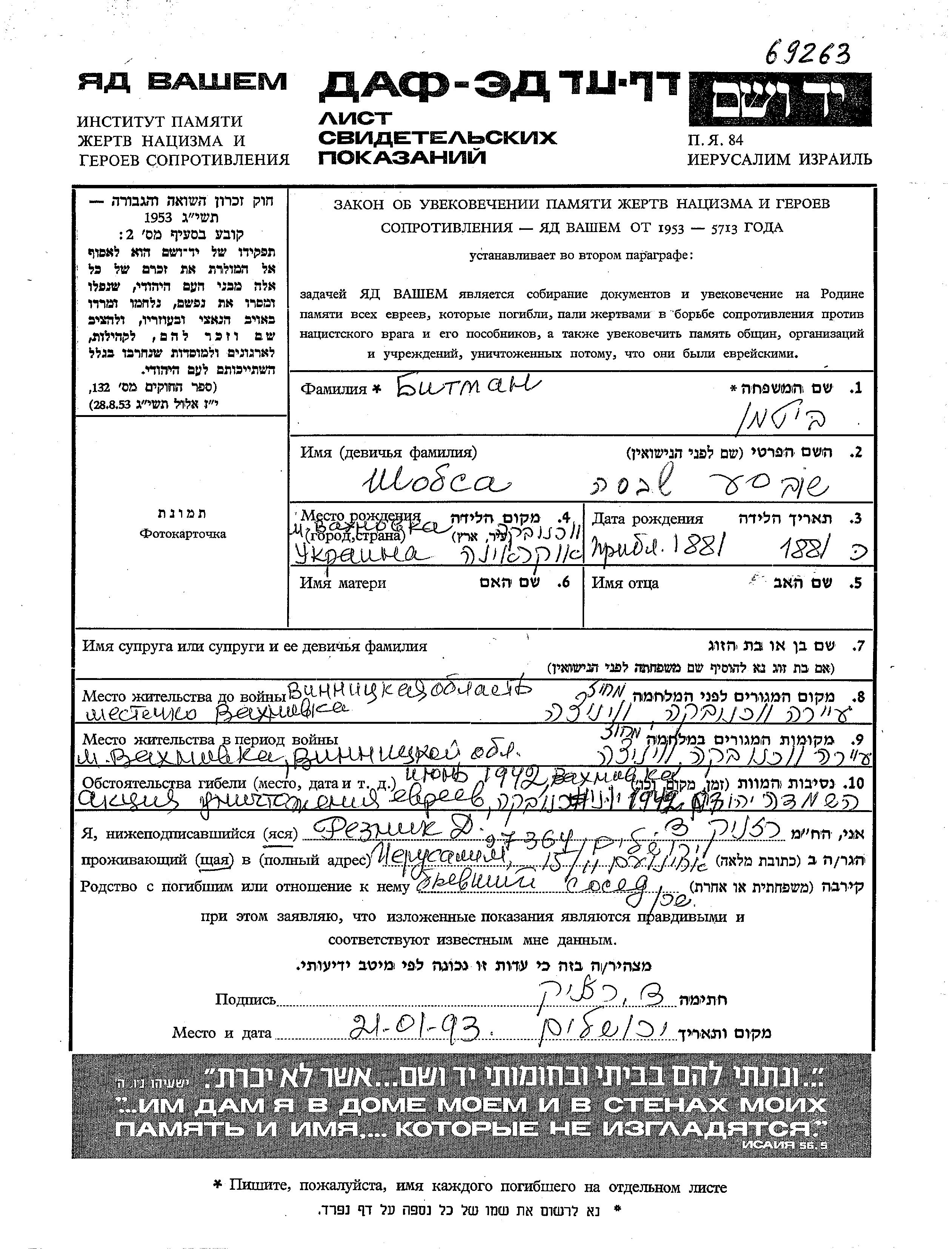 Bitman Shobsa 1881 Vakhnovka, Ukraine (USSR) Page of Testimony