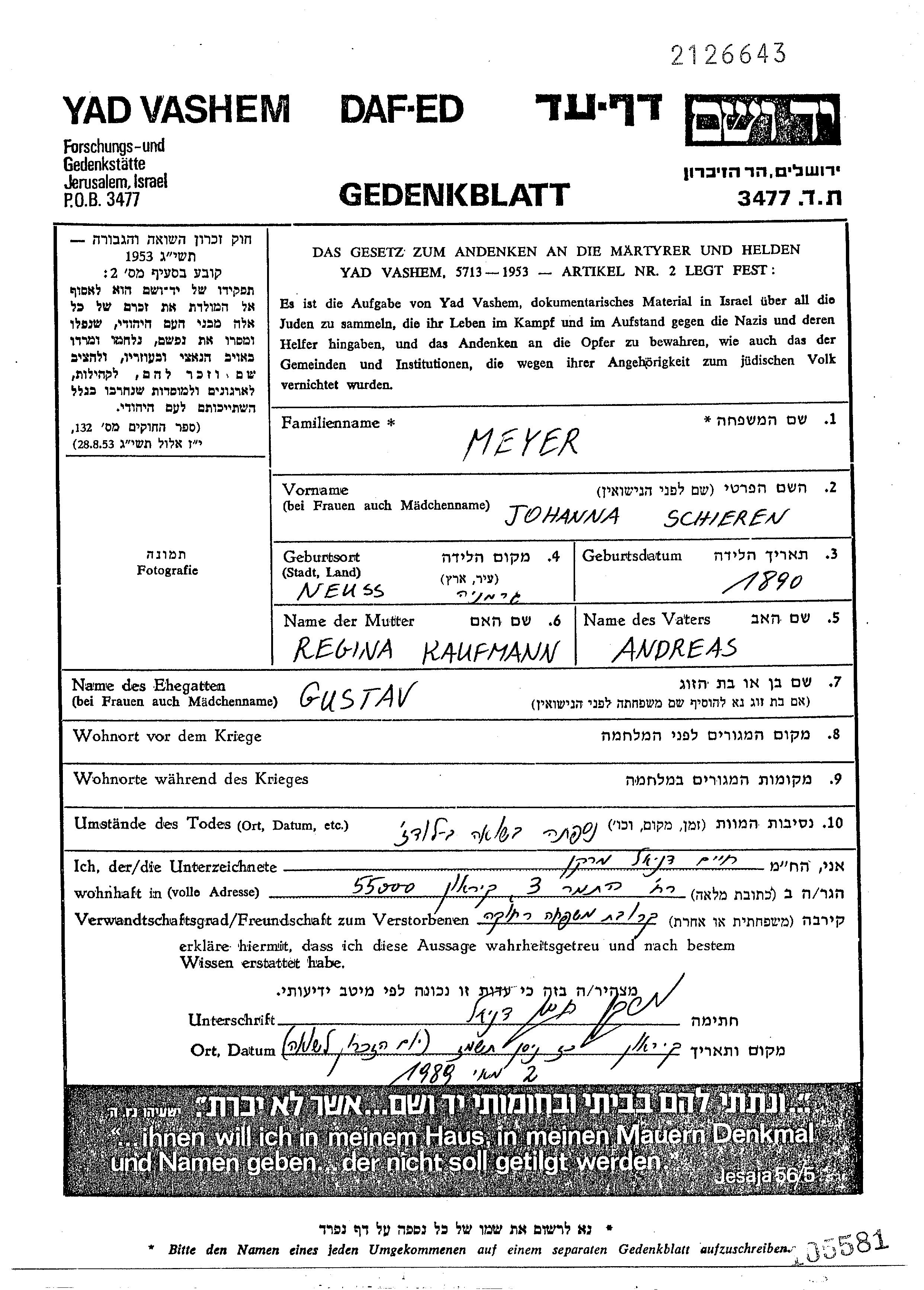 Johanna Meyer nee Schieren Shiran was born in Neuss, Germany, 1890 to Andreas and Regina nee Kaufmann. She was married to Gustav. Johanna was murdered in the Shoah. Place of death: Lodz, Poland.