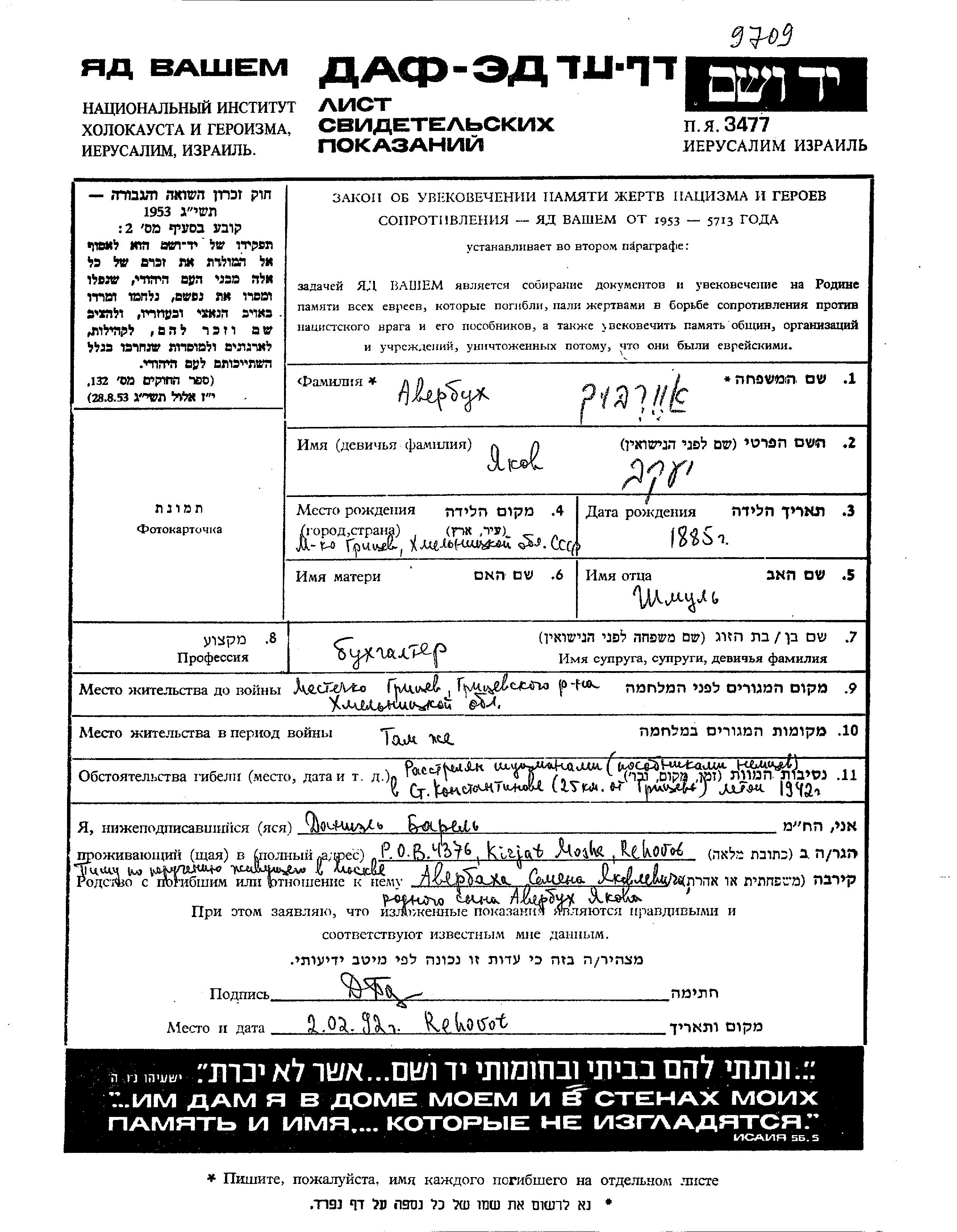 Yakov Averbukh was born in Gritsev, Ukraine (USSR), 1885 to Shmul. He was a bookkeeper and married. Prior to WWII he lived in Gritsev, Ukraine (USSR). During the war he was in Gritsev, Ukraine (USSR). Yakov was murdered in the Shoah. Place of death: Starokonstantinov, Ukraine (USSR), 1942.