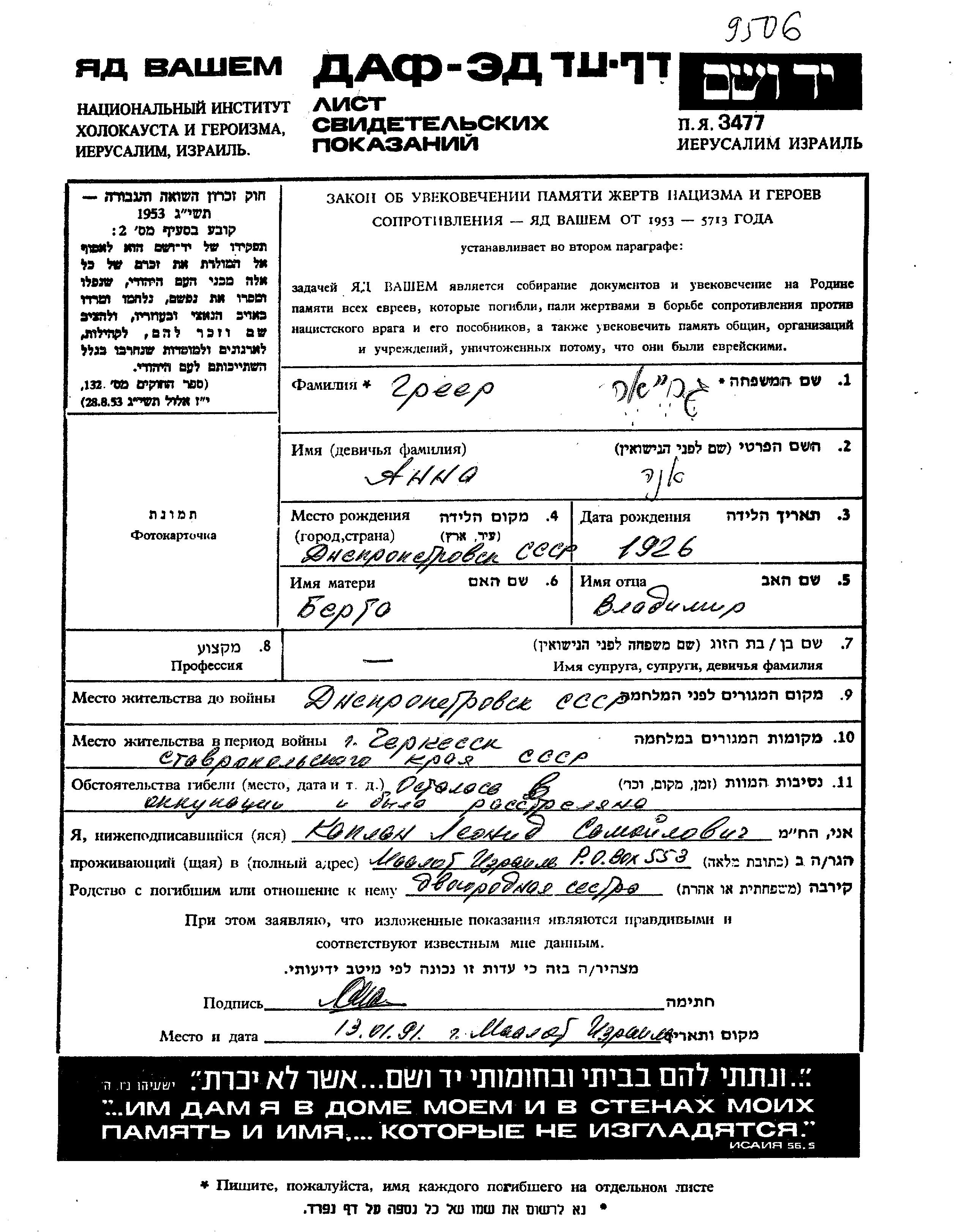 Greyer Ana 1926 Dnepropetrovsk, Ukraine (USSR) Page of Testimony