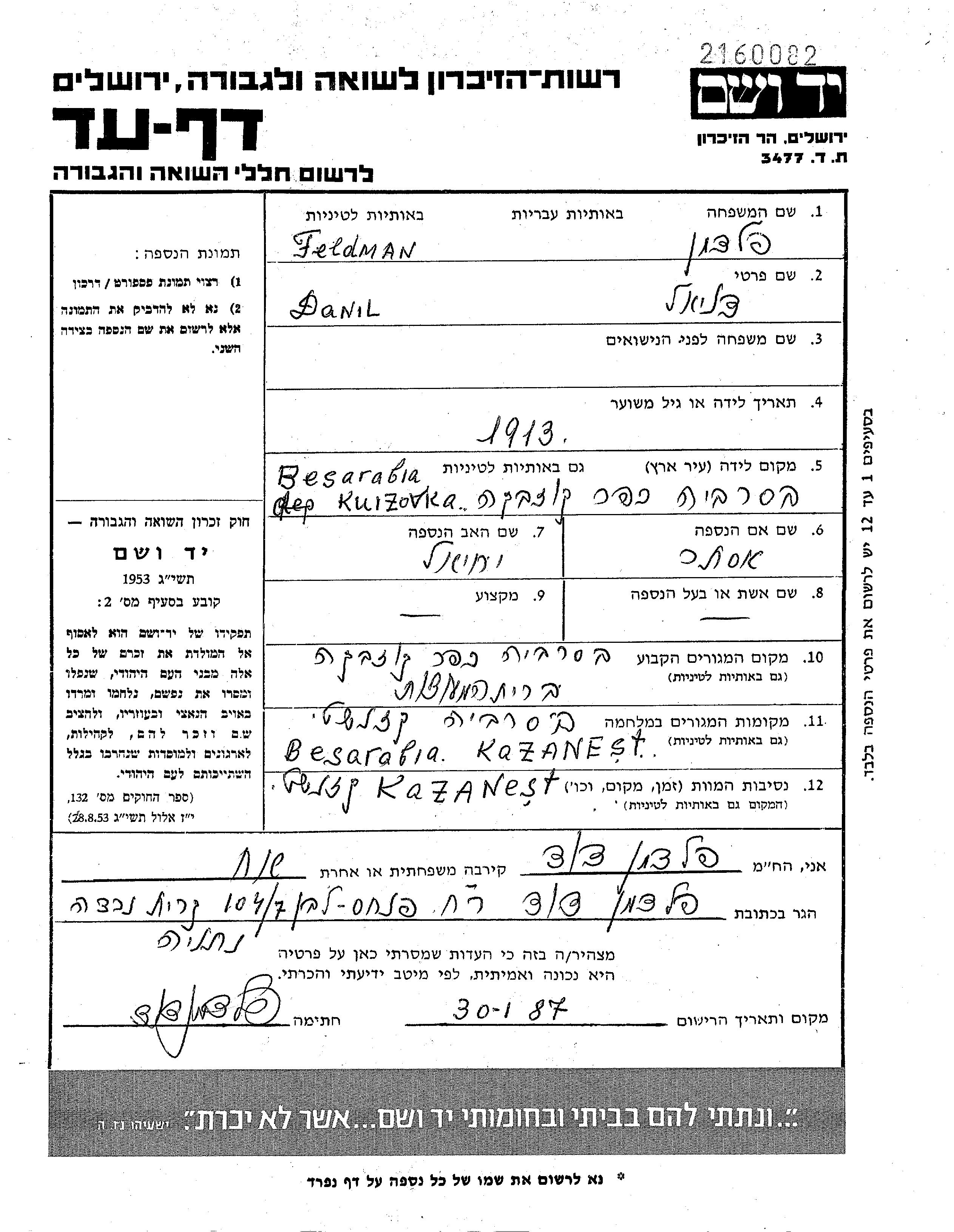 Feldman Danil 1913 Cuizovca, Romania Page of Testimony
