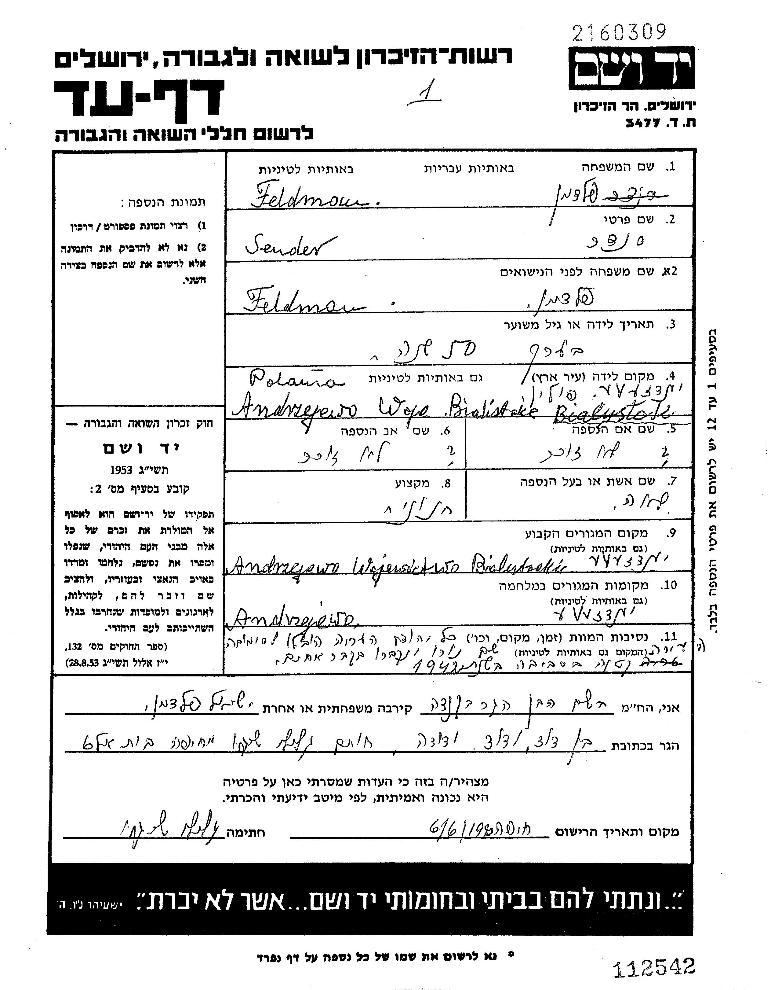 Sender Feldman was born in Andrzejewo, Poland. He was a shop owner and married to Lea. Prior to WWII he lived in Andrzejewo, Poland. During the war he was in Andrzejewo, Poland. Sender was murdered in the Shoah. Place of death: Szumowo, Poland.